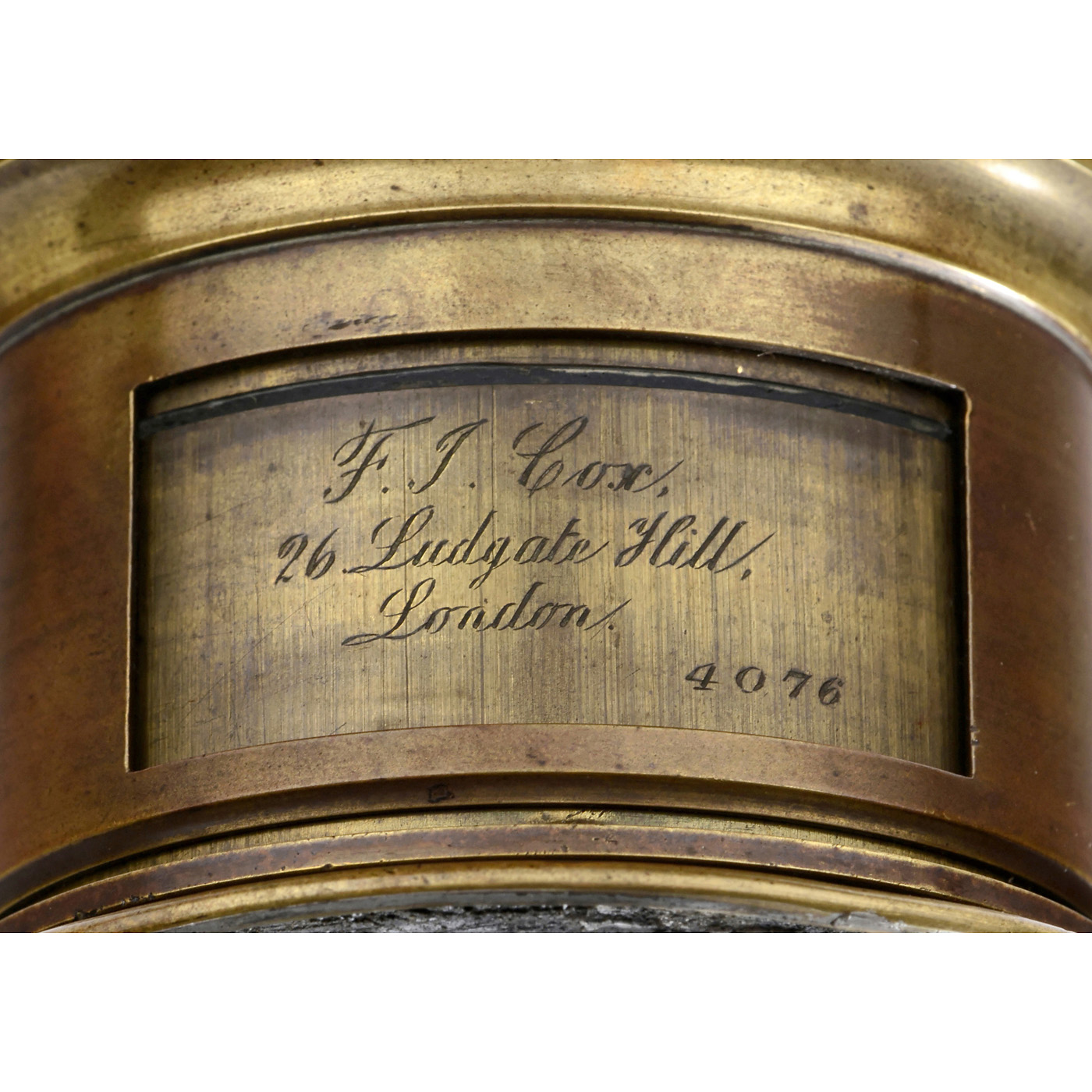 No. 4076, portrait lens for use with waterhouse stops (3 included) with a focal length of approx. 20 cm, with rack-and-pinion focusing (working), height approx. 13 cm, front lens Ø approx. 60 mm. Solder on sunshade hood partly loose. F.J. Cox numbers amongst the most renowned early English opticians. Rare!