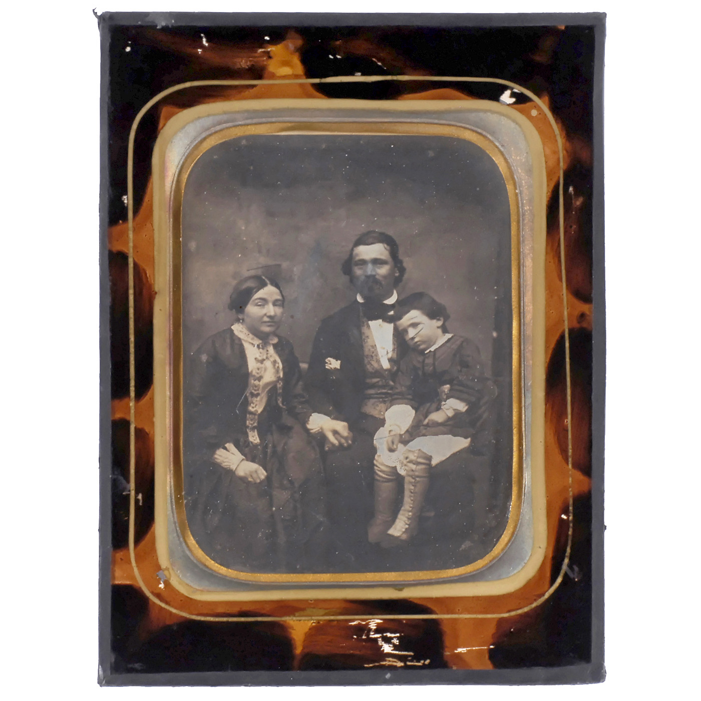 Back labeled: "Mariage de Souliard Georges, Janvier 1847 …". ½ plate, visible image size 3 ½ x 4 ½ in. (8,5 x 11,5 cm). Portrait of a married couple with son. Border in clean condition, excellent illumination and contrast.