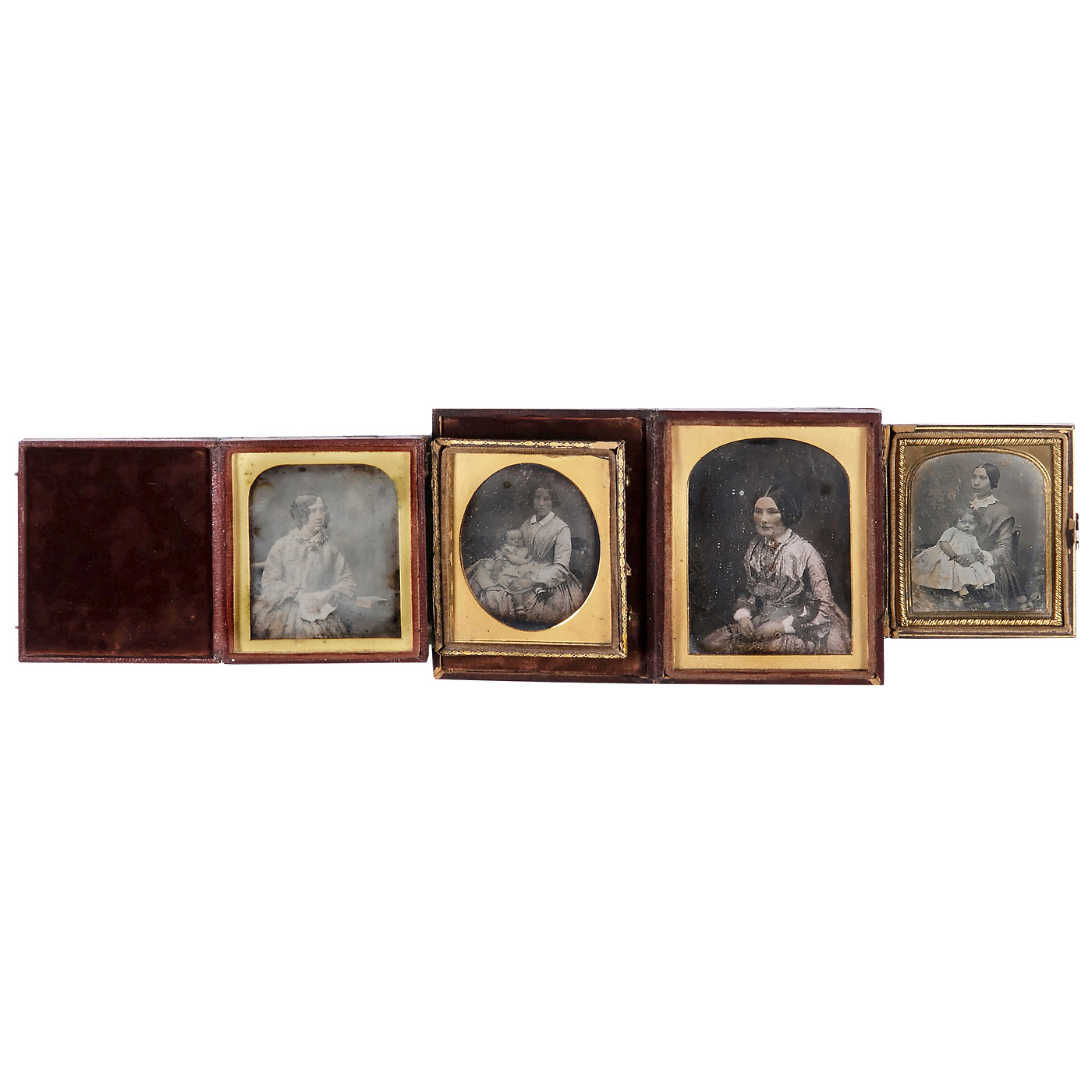 1) Daguerreotype by Crespon Fils, c. 1845. Antoine Crespon, à Nimes (the first daguerreotype photographer of Nimes, 1825-1893). ¼ plate, cover glass broken. Portrait of a couple, not tarnished. Excellent illumination and contrast, newly sealed, photographer's label on back (2-3/-) - 2) Portrait of a lady, 1/6 plate, back of the case: "Beard's Photographic Institutions, London", tarnished, case complete. - 3-4) 2 portraits of ladies with children, 1/6 plate, anonymous, both slightly tinted and with good illuminations (one daguerreotype slightly tarnished), 2 complete cases. - And: 5) Portrait of a lady, ¼ plate, lightly colored, tarnished, complete case. (2-4/-)