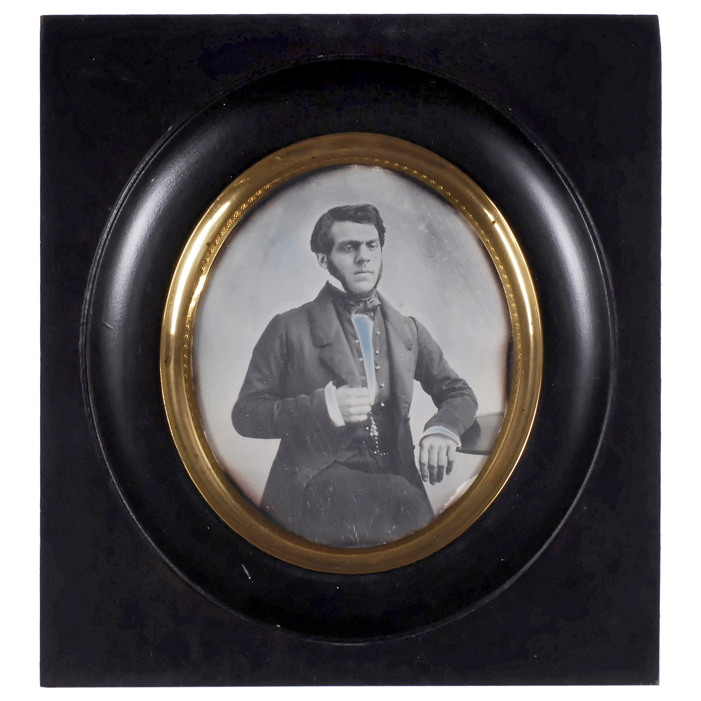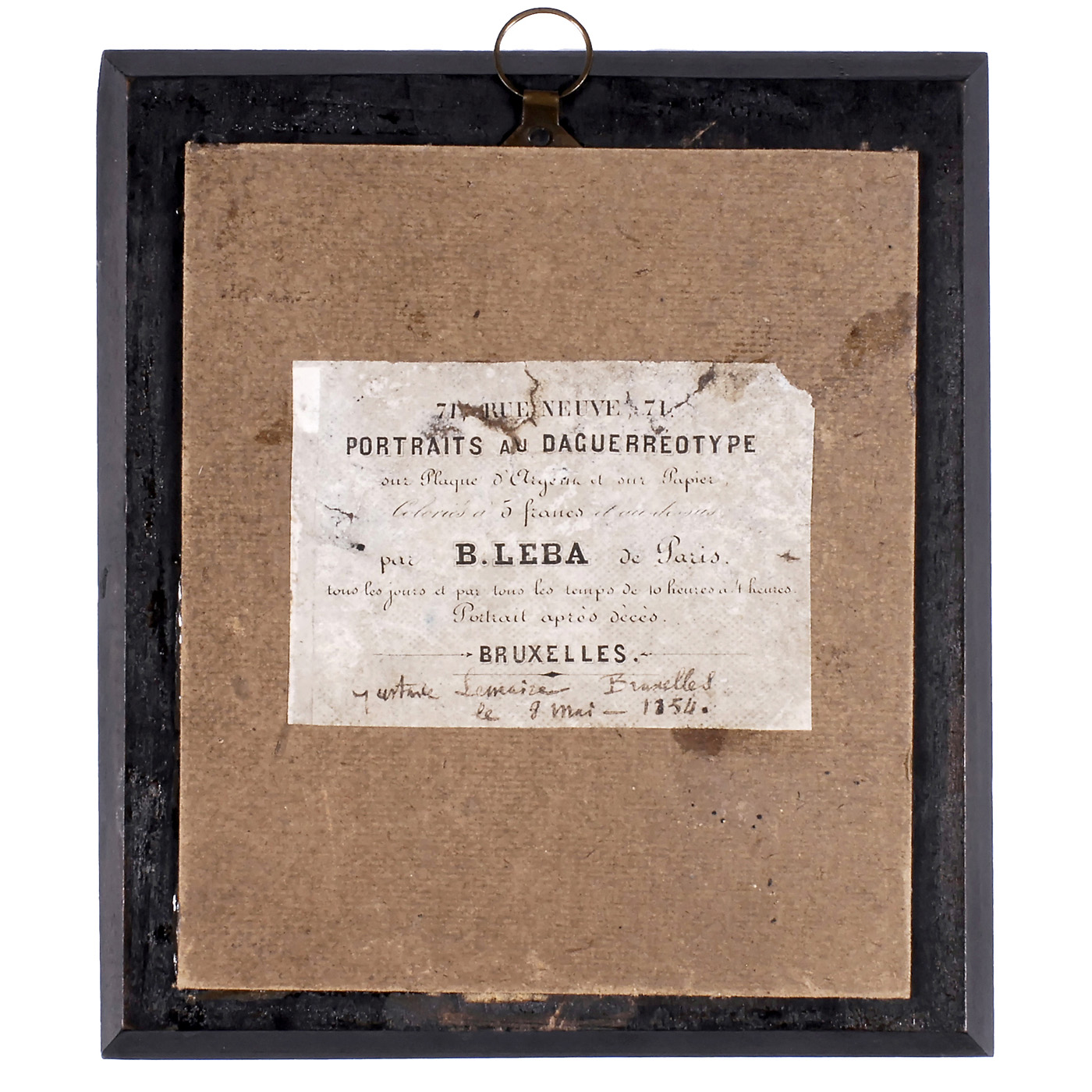 Photographer's label on back: "B. Leba, Paris", ¼ plate, framed (5 ½ x 6 ¼ in.), gentleman's portrait, background and figure hand-colored, minimal rim tarnish. Excellent illumination and contrast!