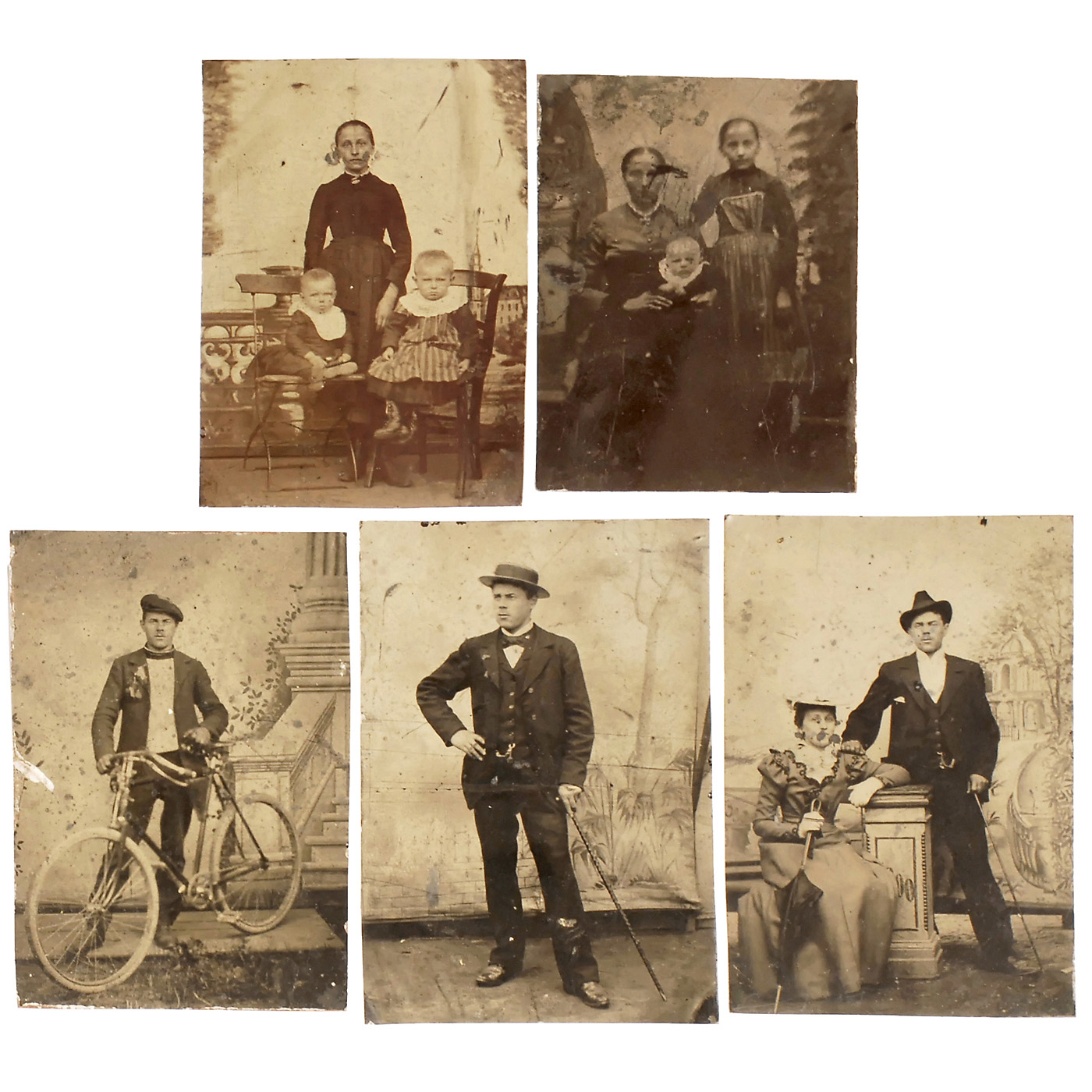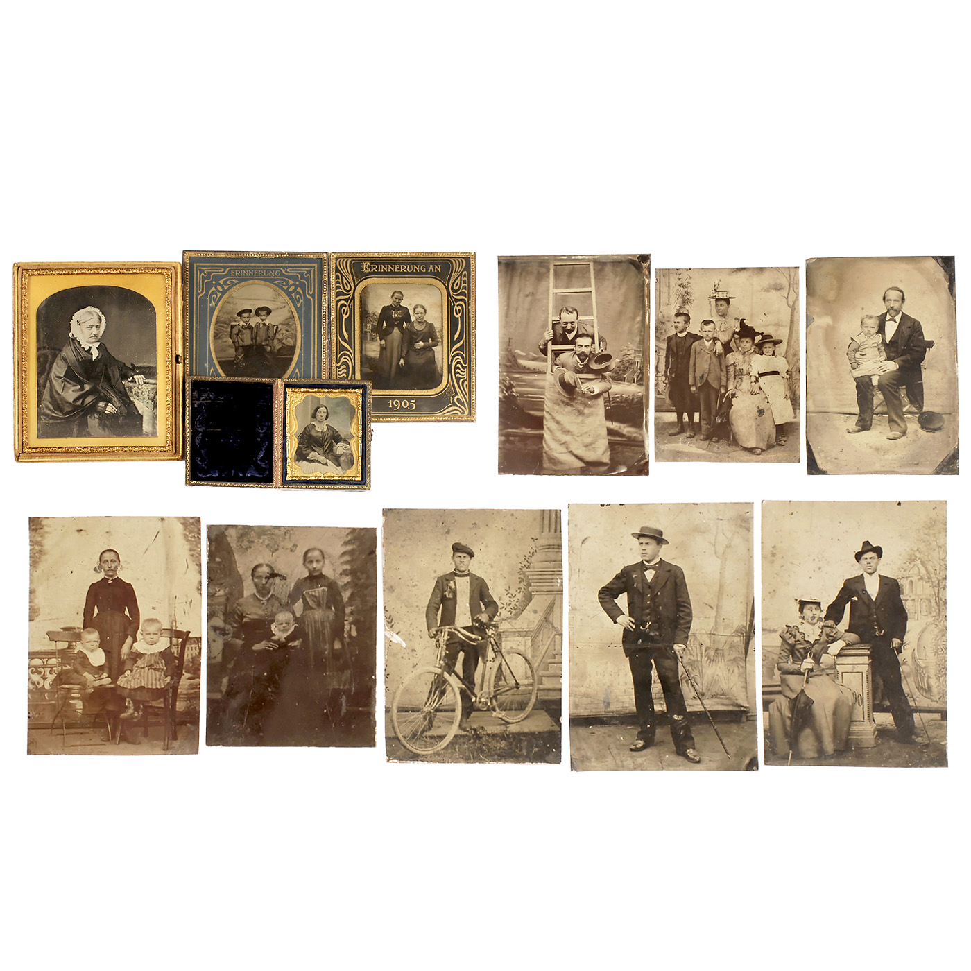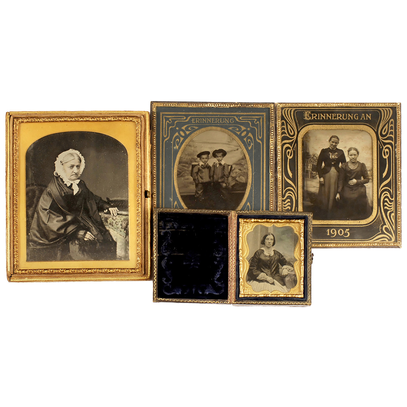 1) Ambrotype, ¼ plate, portrait of an elderly lady, hand-tinted, with gilt highlights, half case. - 2) Ambrotype, smaller than 1/9 plate (approx. 4,5 x 6 cm), portrait of a lady, lightly tinted, decorated brass passe-partout, in complete case. - 3) Damaged ambrotype, ¼ plate, group of 5 people (not pictured). - 4-5) 2 tintypes, in frame 9 x 12 cm, "Erinnerung an 1905". - 6-13) 8 mixed tintypes, c. 1900. - In addition: Framed picture postcard in the style of a daguerreotype (not pictured).