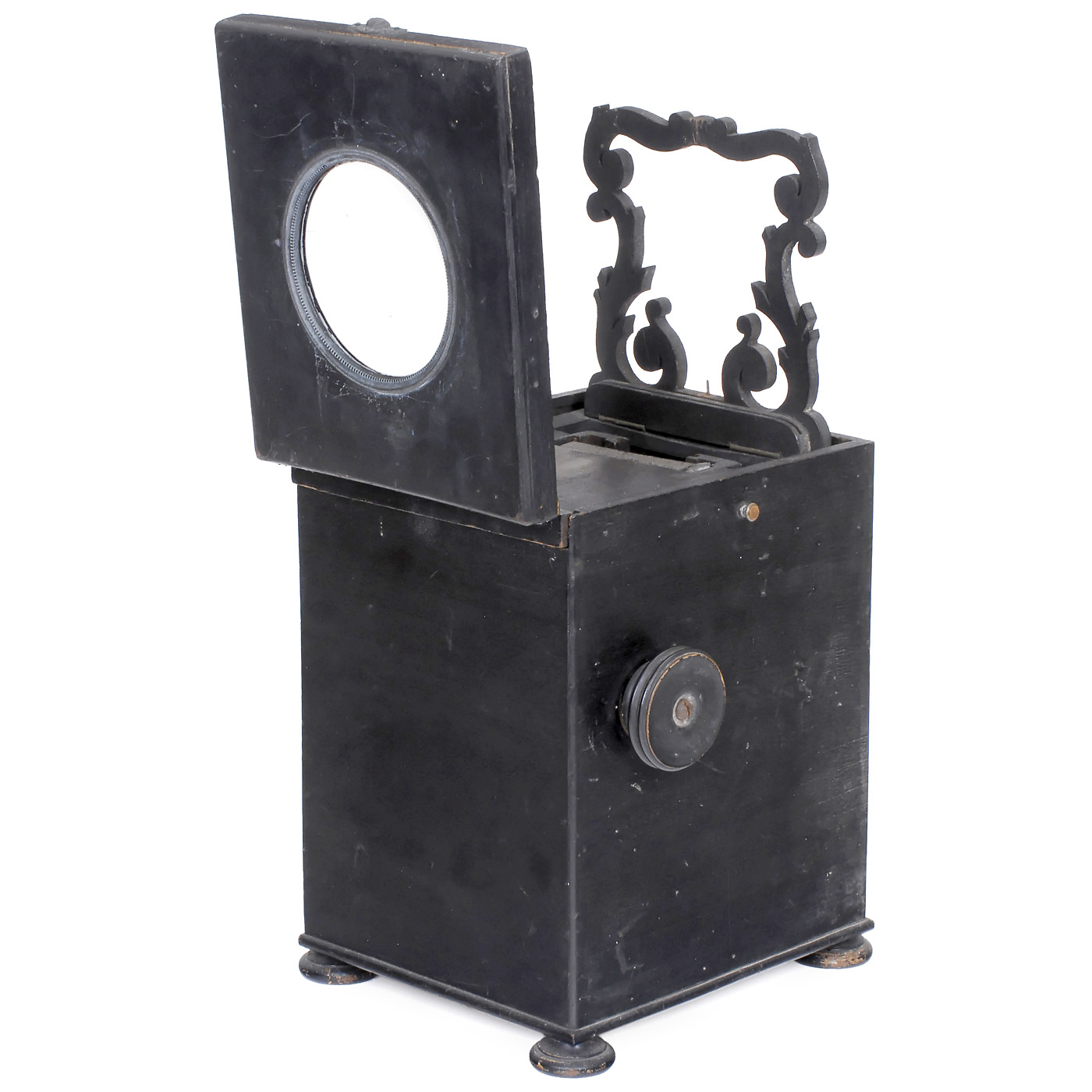 Graphoscope, unmarked, but presumably French. Automatic viewer for CdV, black-lacquered wooden box, height 18 in., lens diameter 3 ½ in., working well. - Very rare mechanical viewer for CdV.