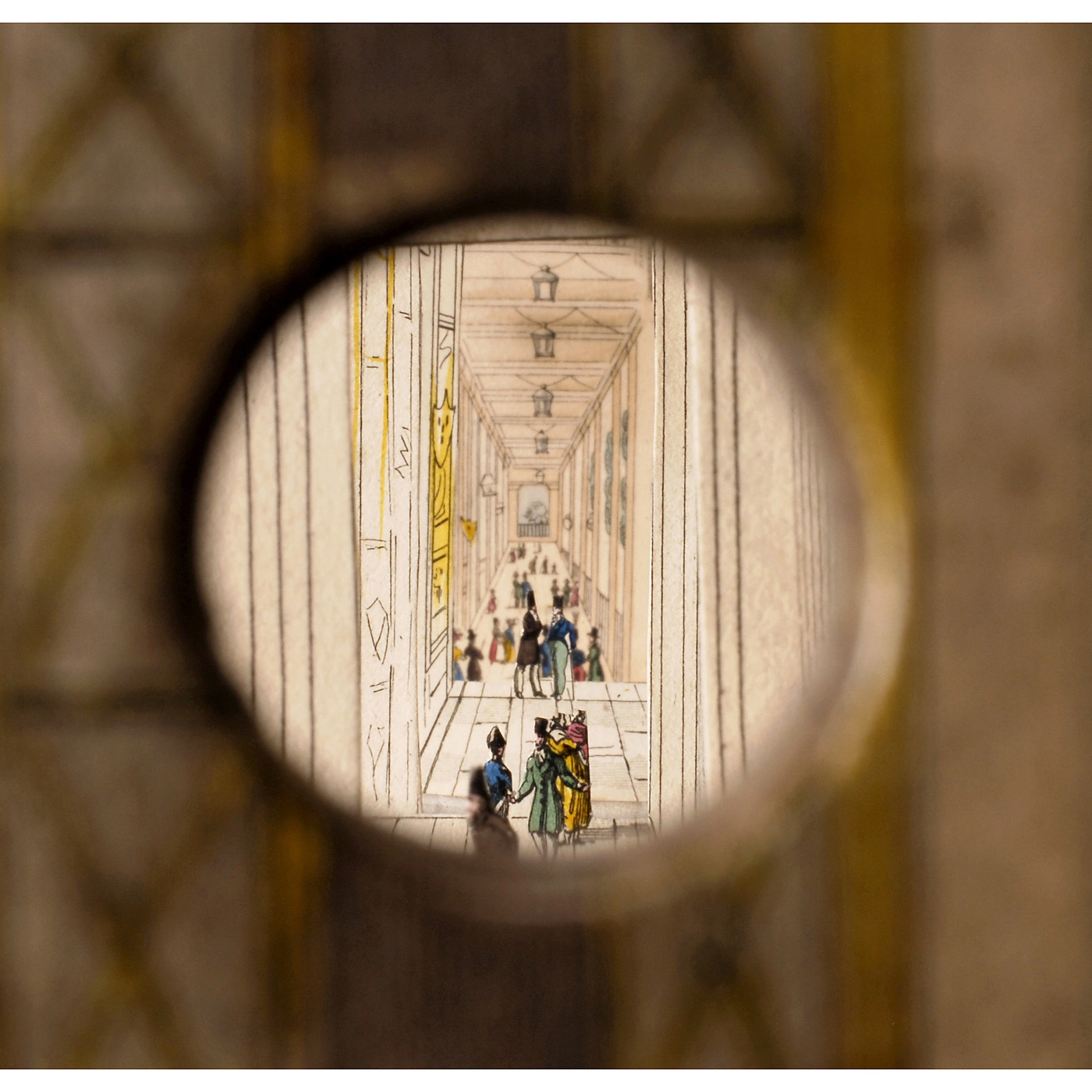 3 spyholes, 6 sections, size 7 ½ x 5 in., four-colored lithograph, showing Parisian Boulevard with fountains and squares. Very good condition!
