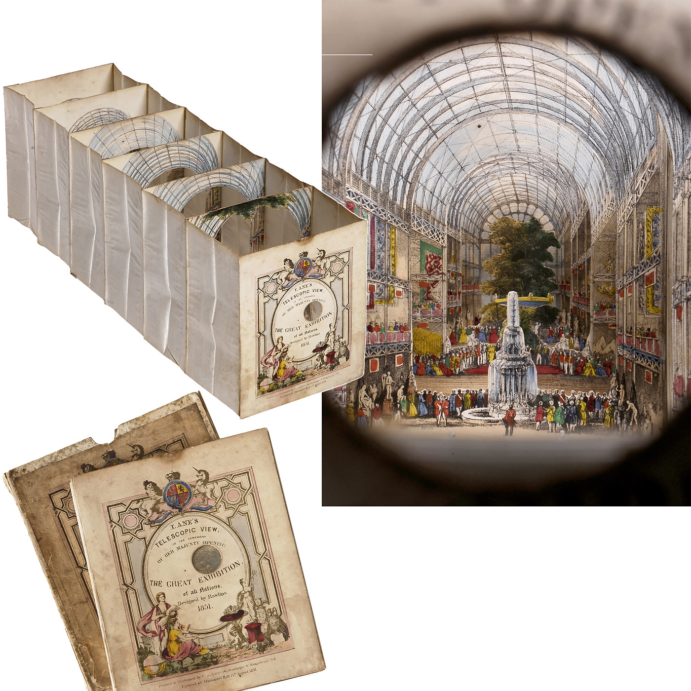 "Designed by Rawlins", England. One spyhole, 7 sections, size 7 1/6 x 6 in., length 21 in., hand-colored lithograph, with slipcase. - Dreamlike scenes of the first World's Fair!