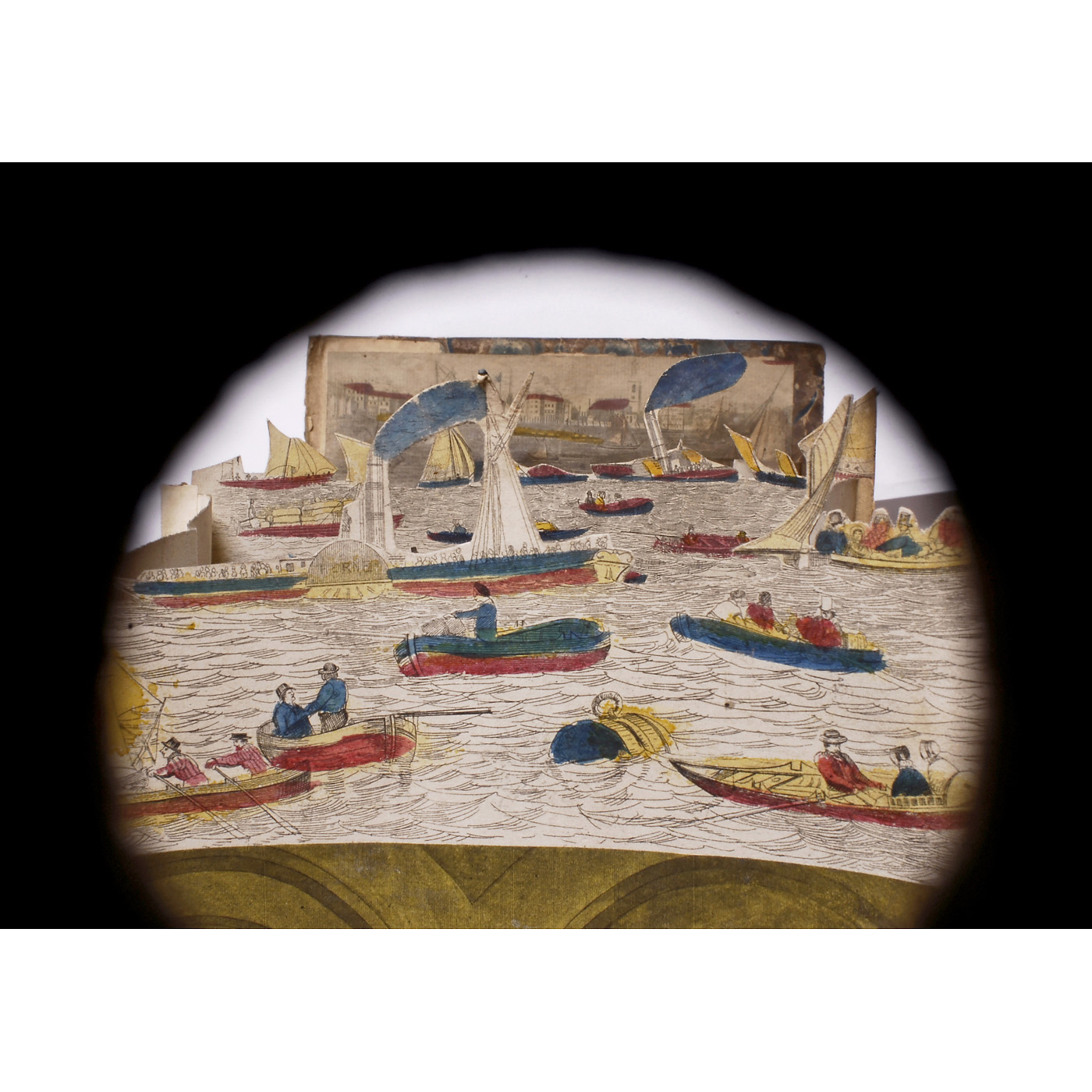 3 spyholes, 3 sections, size 7 x 7 4/5 in., length 21 2/3 in., hand-colored lithograph. In book jacket.