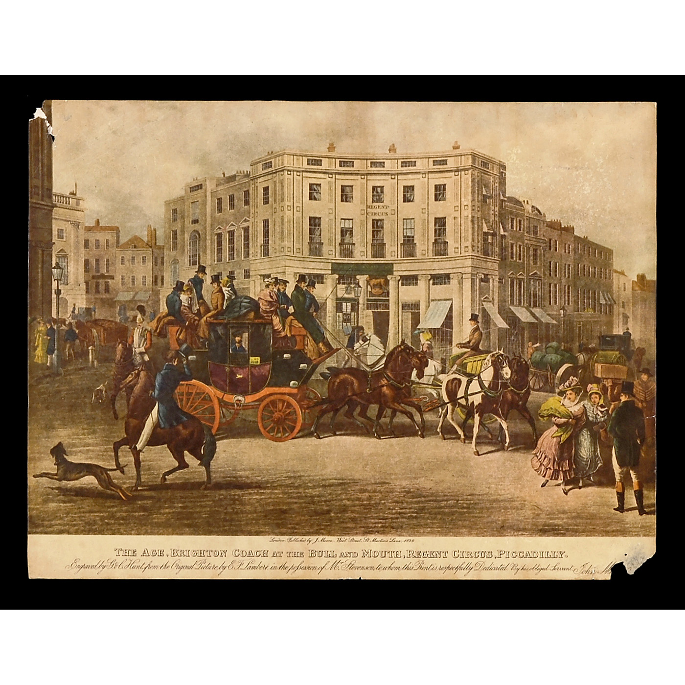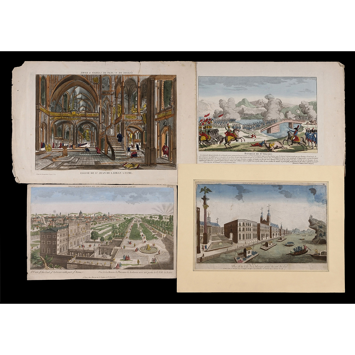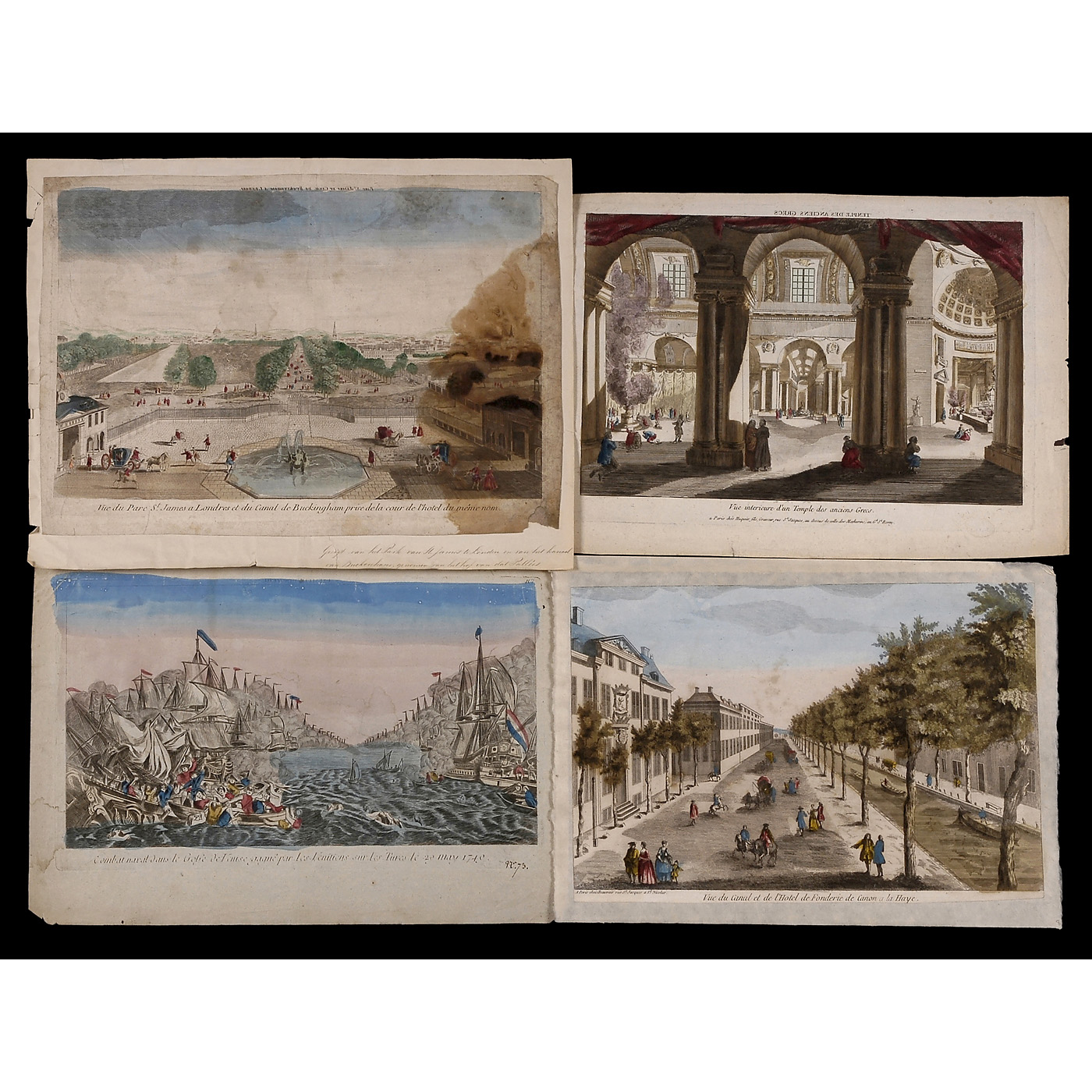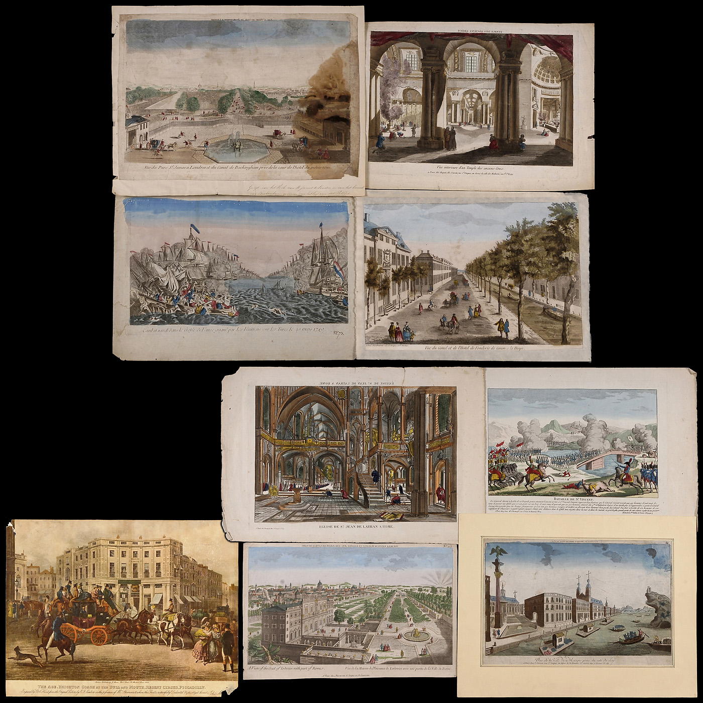 Original hand-colored copperplates with original titles. 1) Bataille de St. Vincent. - 2) Eglise de St. Jean de Latran à Rome. - 3) Vue de la ville du Maxique prise du coté du Lac. - 4) Vue de Canal et de l'hotel de Fonderie de Canon à la Haye. - 5) Vue interieure d'un Temple des anciens Grecs. - 6) Vue du Parc St. James à Londres et du Canal de Buckingham prise de la cour de l'hotel du même nom. - 7) Vue de la Maison de Plaisance de Lodovise avec une partie de la ville de Rome. - 8) Unreadable. - Size 10 5/8 x 16 ½ in. - In addition: Lithograph from London, 1829.