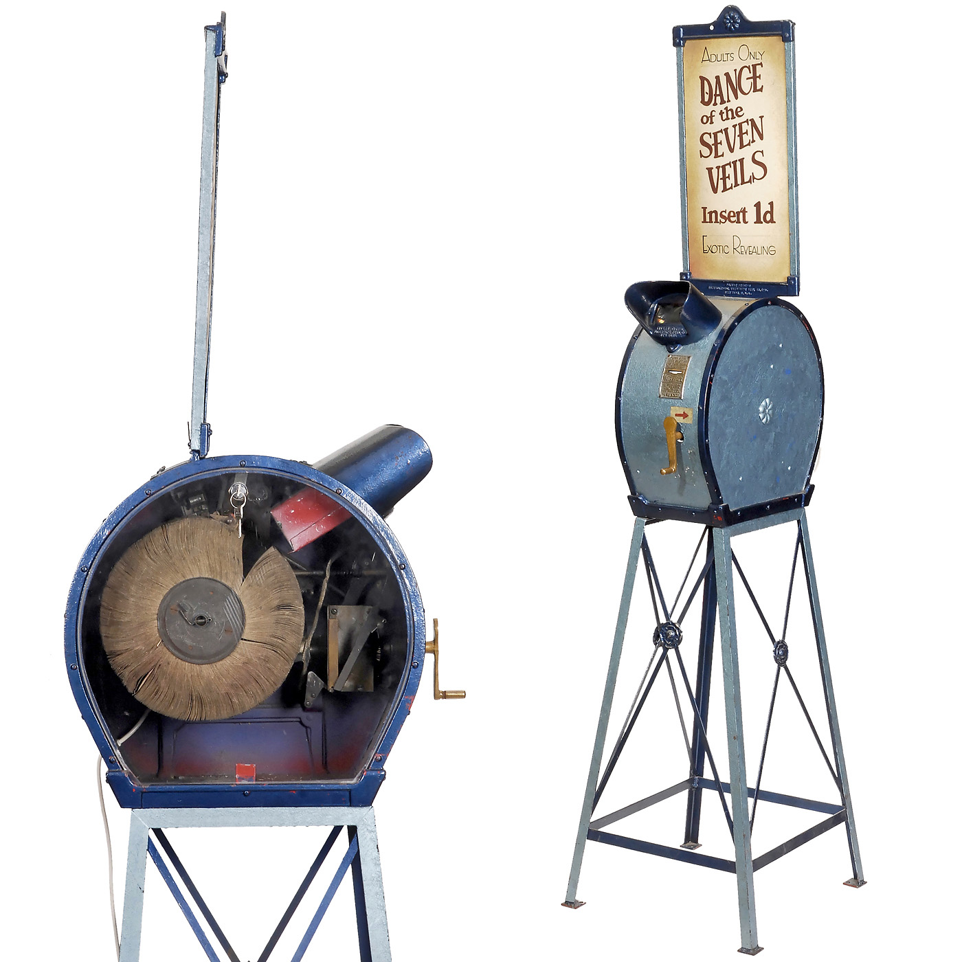 The International Mutoscope Reel Co., New York. Metal body on stand, blue/green-lacquered finish, coin-operated (not working), handcranked, serial no. AB554, height of the Mutoscope approx. 75 in., electric light (220 V), loupe with crack, with reel, poster title: "Adults Only: Dance of the Seven Veils", side flap replaced with a Perspex disc.
