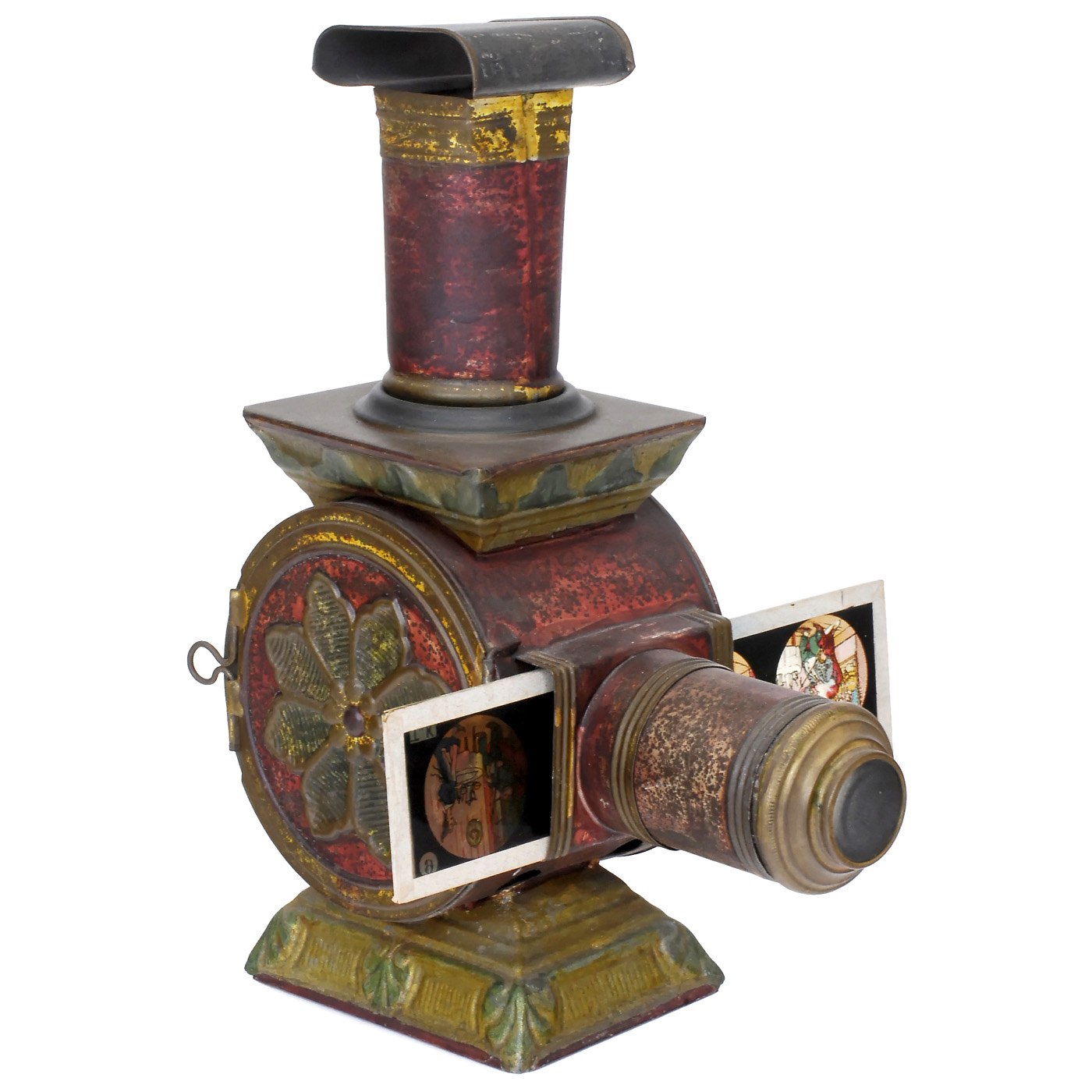 Frères Lapierre, Paris. Pressed-metal body with polychrome decoration, height of lantern 9 in., for slides of 1 ½ in., original chimney and original lens.