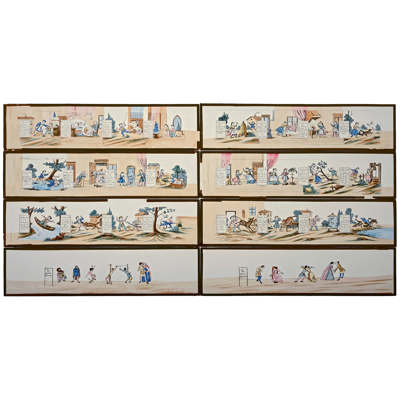 1) Ernst Plank, Nürnberg. Series of 12 magic lantern slides by Planck, c. 1902. Size 4 x 11 3/4 in. Complete series by E.P. "Tafel Nr. 25-36": "Das Lied von der Glocke", "Der Kampf mit dem Drachen", "Geschichte von Aladdin und der Wunderlampe", with original lyrics and wood box. - And: 2) Series of French lantern slides 3 3/4 x 15 in., c. 1840. Lantern panoramic slides (9,5 x 38 cm), series of 6 slides with original labels "touche à tout" (similar to stock-headed Peter), hand-colored lithographs with printed legends. Rare and complete series. - In addition: 2 panoramic slides, hand-colored lithographs, with text "La guerre" and "La paix", c. 1860. Wood box.