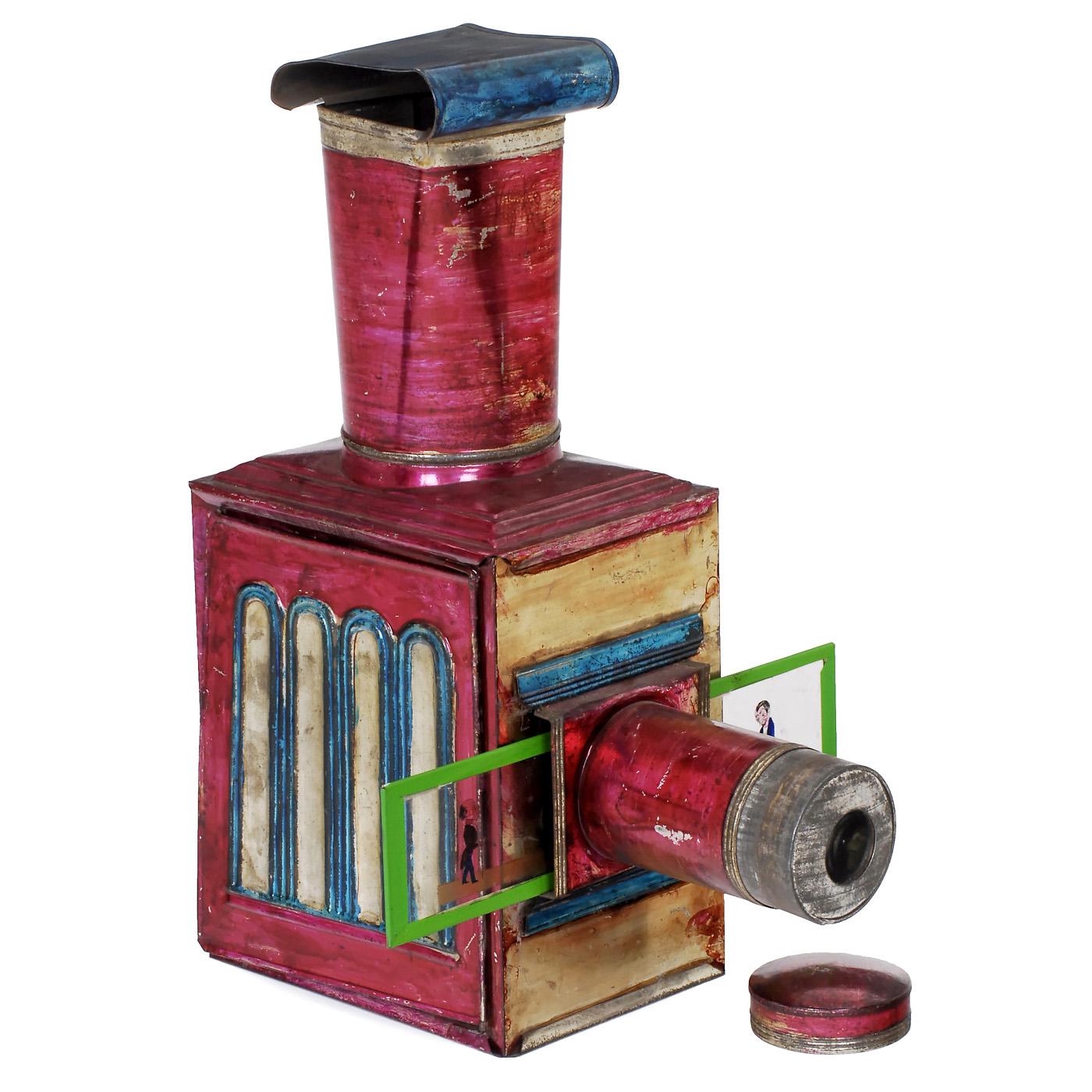 Fréres Lapierre, Paris. This magic lantern was produced in 4 sizes, this one 14 ½ in. high, for slides of 2 ¾ in. Original polychrome lacquer, door slightly distorted, chimney and lens original. With lens cap.