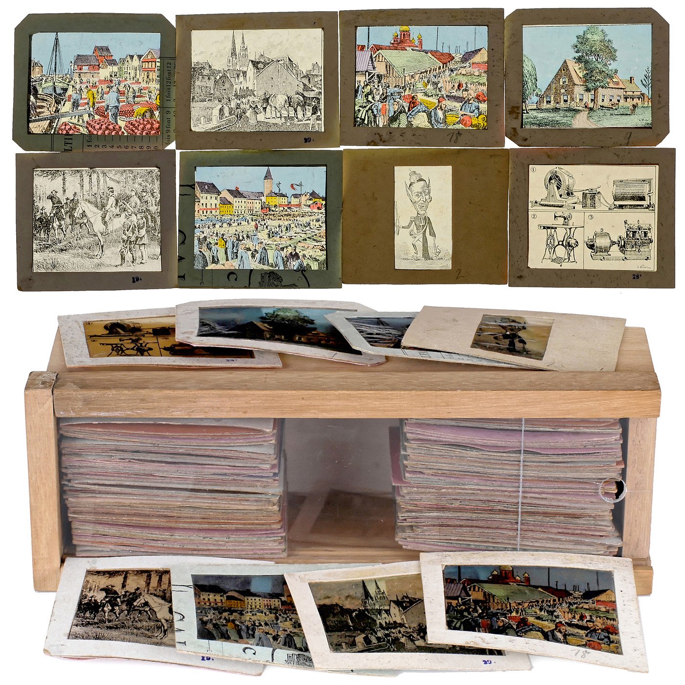 Over 120 transparencies, France, drawings of people, cities, landscapes, card frames of 8,5 x 10 cm (3 ½ x 4 in.). In wood box.