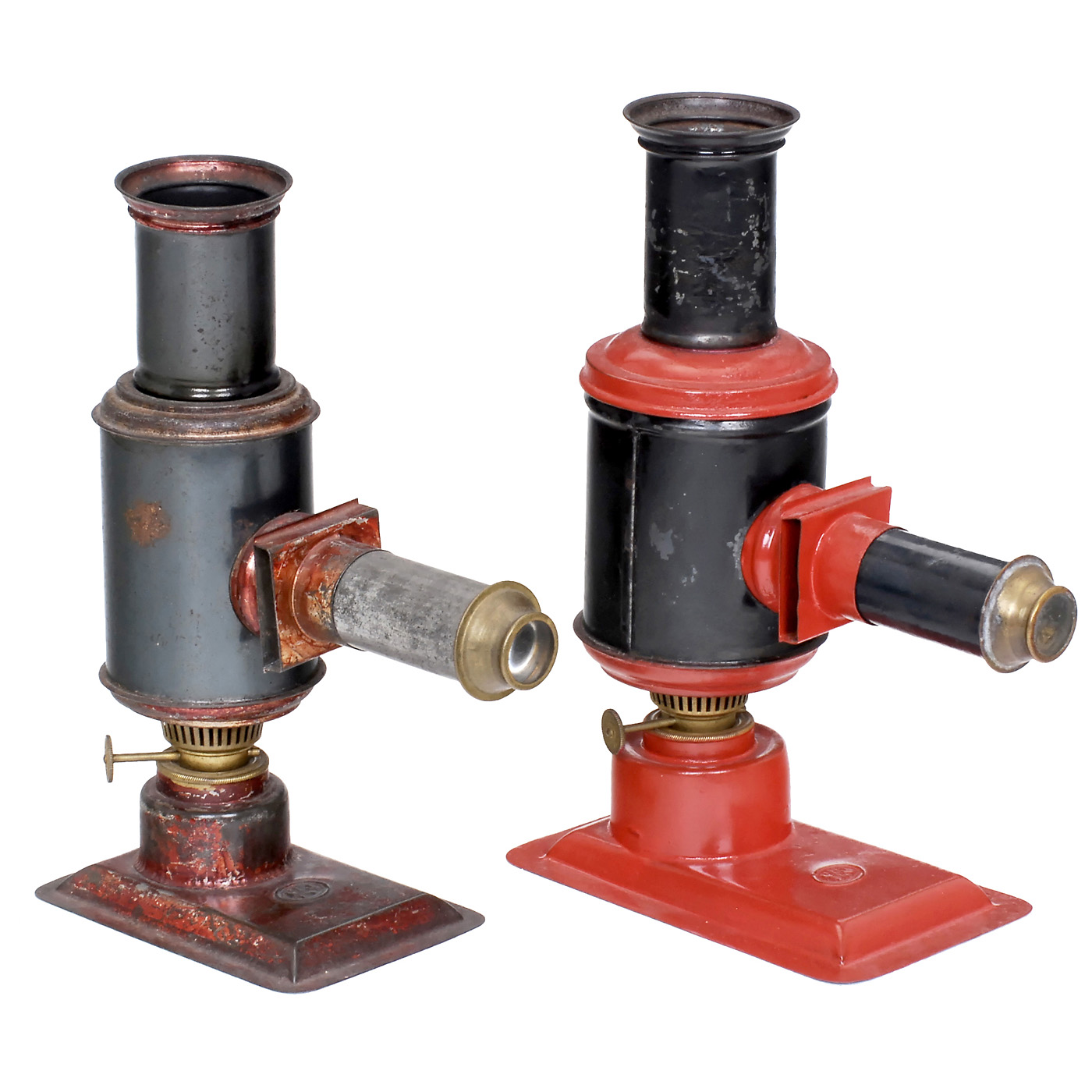 Ernst Plank, Nuremberg. 1) Small magic lantern on burner, partly relacquered, for slides of 1 2/5 in., height 7 4/5 in. - And: 2) Small magic lantern on burner, original condition, for slides of 1 2/5 in., height 7 ½ in.
