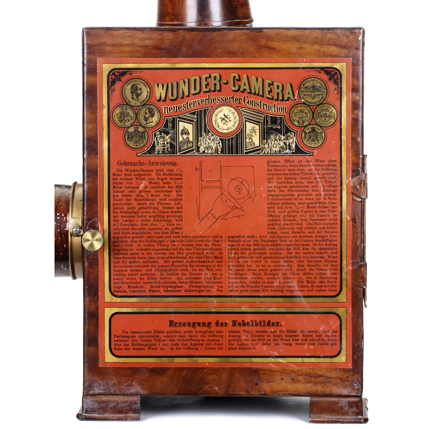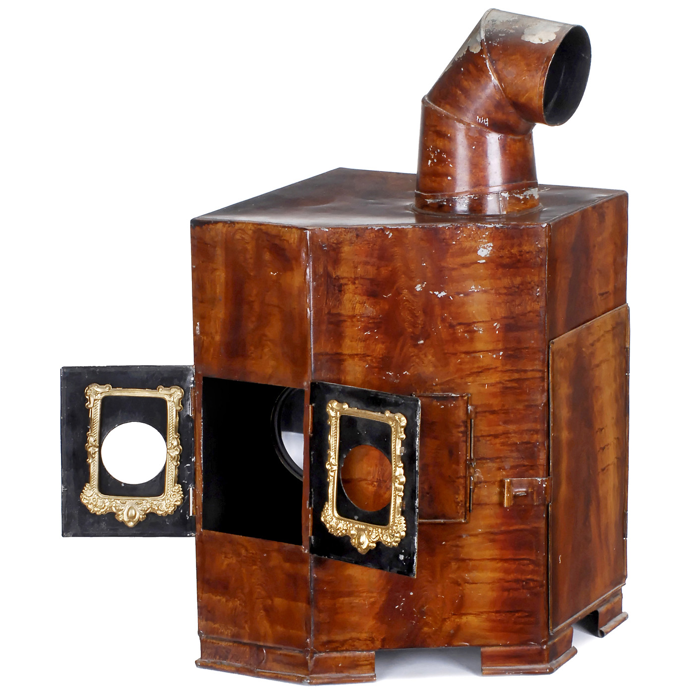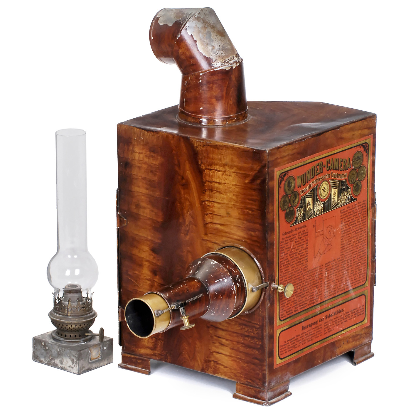 Neuerster verbesserter Construction. Gebrüder Mittelstrass, Magdeburg. Large German postcard and slide projector for 3-inch slides and 2 ½-inch carte-de-visite photos, with grain-painted body, decorative instruction label, chimney and brass-bound lens, height approx. 21 2/3 in., with paraffin illuminant. Rare projector!