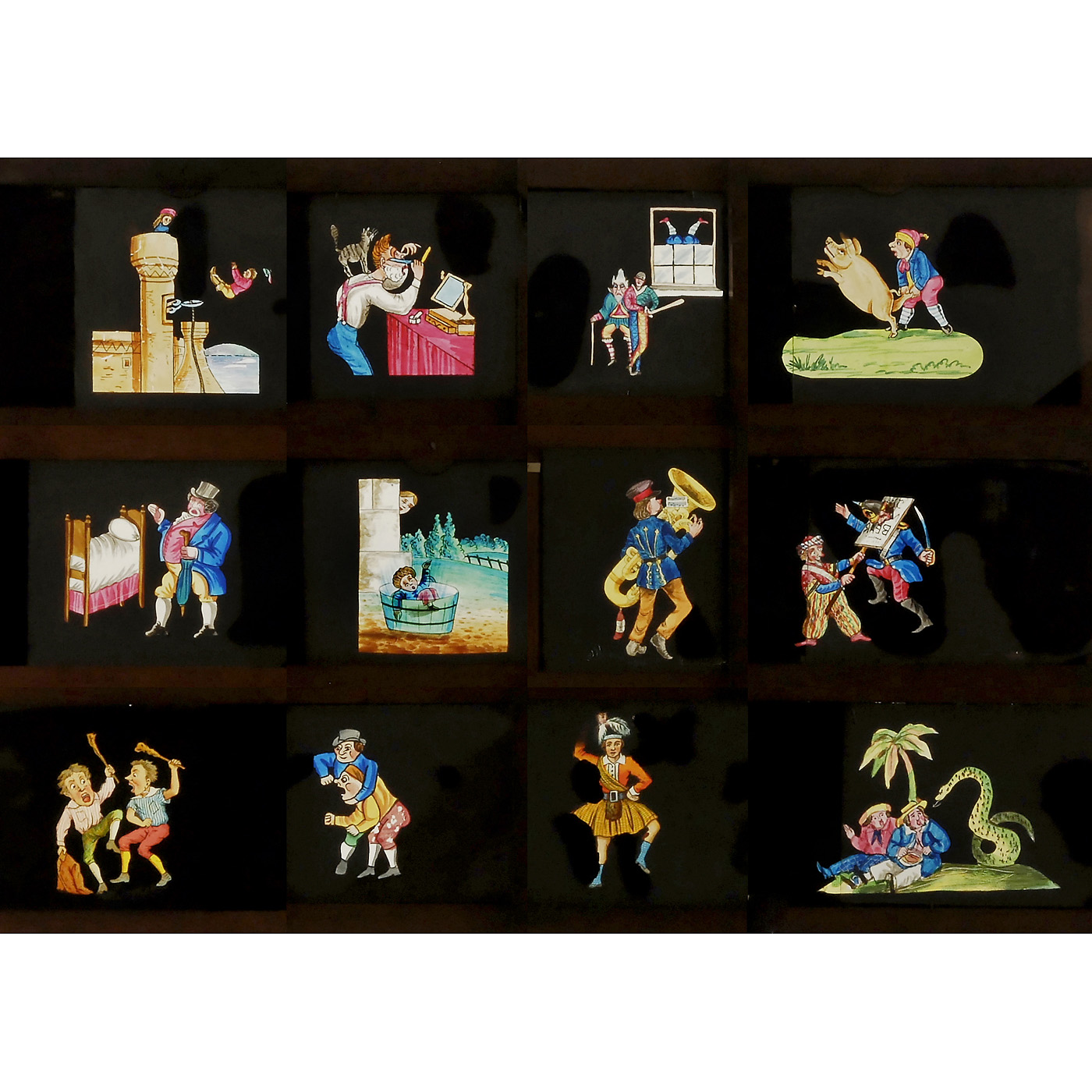 Presumably England, wood frame 4 x 7 in., predominantly colored, amusing motifs.
