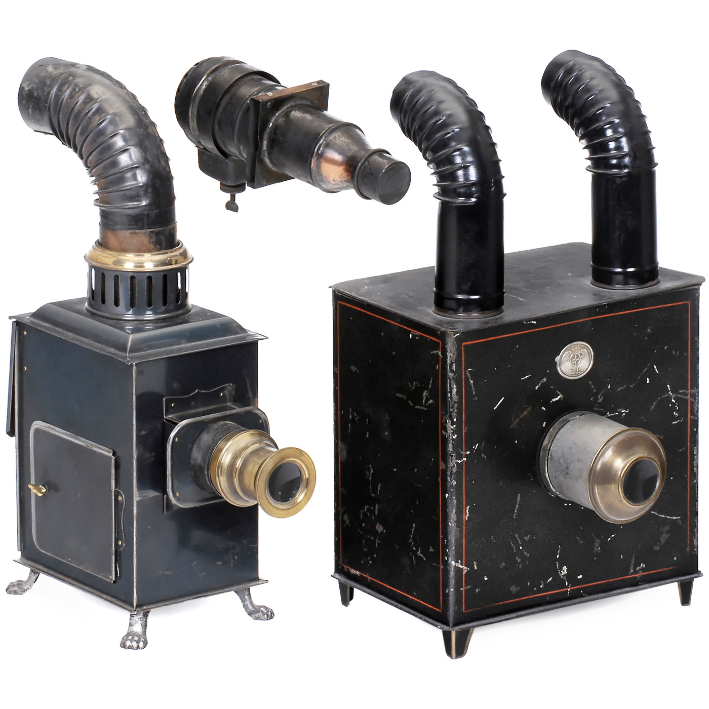 1) Ernst Plank, Nürnberg. "Wunderkamera Polyopticon", black-lacquered metal housing with red ornamental strips, 2 chimneys, height 14 ½ in. - 2) Small magic lantern (projector), presumably for promotion slides, for slides of 2 ¼ in., length 7 4/5 in. - And: 3) Magic lantern by Gebr. Bing, Nürnberg, dark sheet iron with pressed paw feet, original burner body, chimney, for lantern slides of 2 in., height 14 1/5 in.