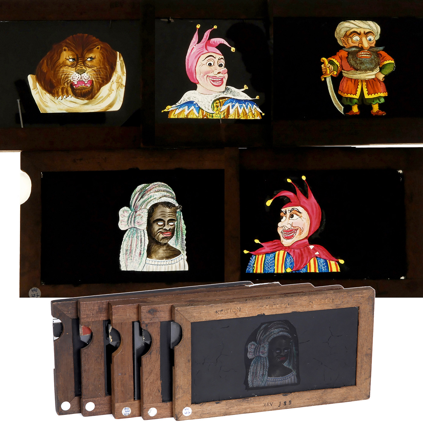 All from England (4 slides presumably from Milliken & Lawley, London), wood frame, size 4 x 6 ¾ in., motif "lion" with double mechanism for eyes and mouth. 4 slides hand-painted.