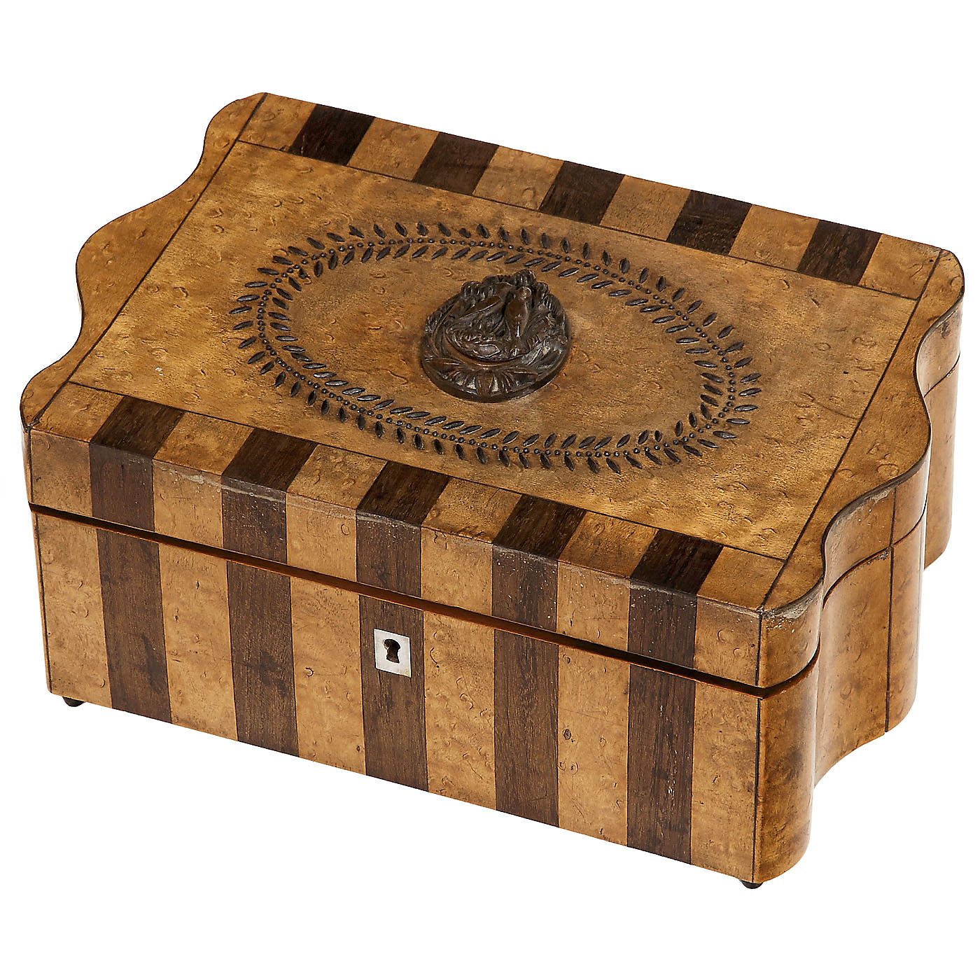 With fitted interior and two trays containing an array of pressed white-metal and other implements, bottles, glasses and an eye cup, lower section with two-air cylinder movement, no. 7382, with sectional comb in 14 groups of 4 or 5 teeth (complete), in burr-wood-veneered case with serpentine sides and carved lignum relief of two birds on the lid, wd.10 in. (26 cm), cylinder 2 ½ in. (6,5 cm), some missing implements, movement in hesitant playing condition. With key.