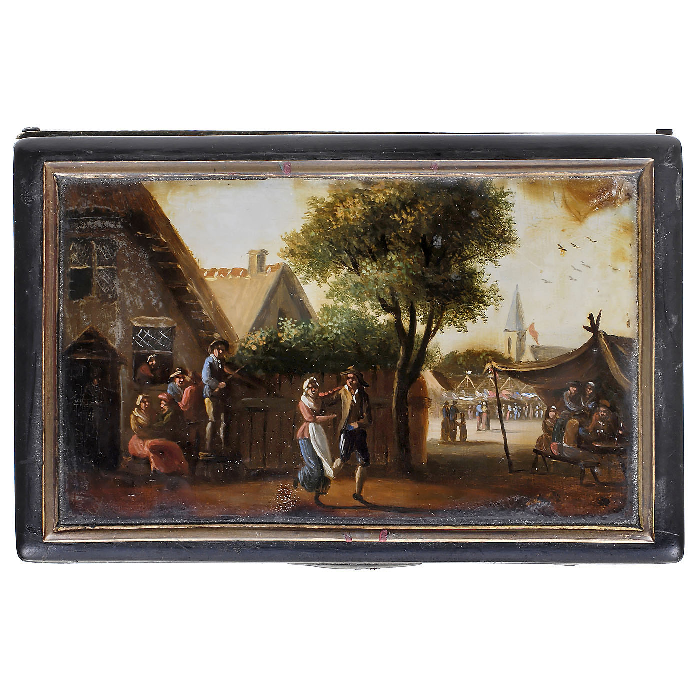 No. 3052, with sectional comb in 17 groups of 4 teeth (complete but not examined out of case), the brass comb base lightly inscribed "Alibert", in composition case with reverse-painted glass lid depicting a country fair, the verso inscribed "3 Cerceles, B, N. 2", wd. 3 ½ in. (9 cm), cylinder 2 3/8 in. (6 cm), case with losses and repairs, lid painting loose, playing condition. With key.