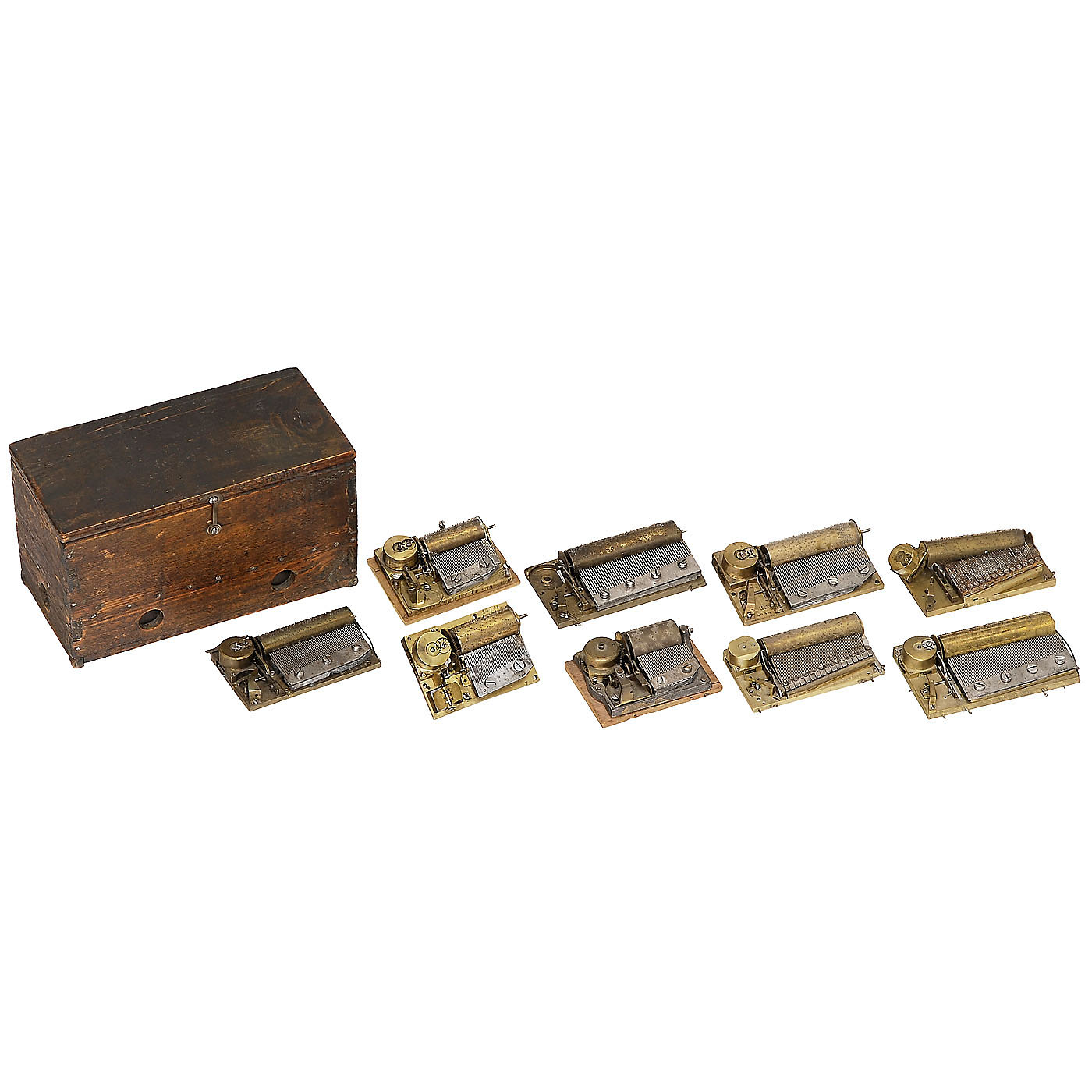 Including a movement by Gustav Rebíček Musikwerk (with damaged comb) in transport case. Interesting lot for restorers. - Literature: Rebíček movement illustrated in Luuk Goldhoorn, "Die Österreichische Spielwerkemanufaktur im 19. Jahrhundert", p. 80.