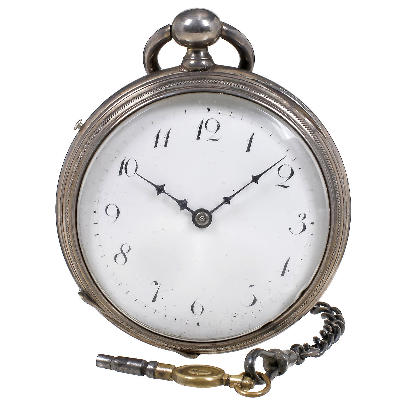 With 2-inch (5 cm) enameled Arabic dial, single-air cylinder movement with 8 pairs of super-imposed teeth, activation pin, finely-engraved silvered brass spring-housing, bridge and cover plates, diameter 2 3/8 in. (6 cm), cylinder approx. ¾ in. (2,2 cm), musical movement in hesitant playing condition, watch movement not running. With key on fob chain.