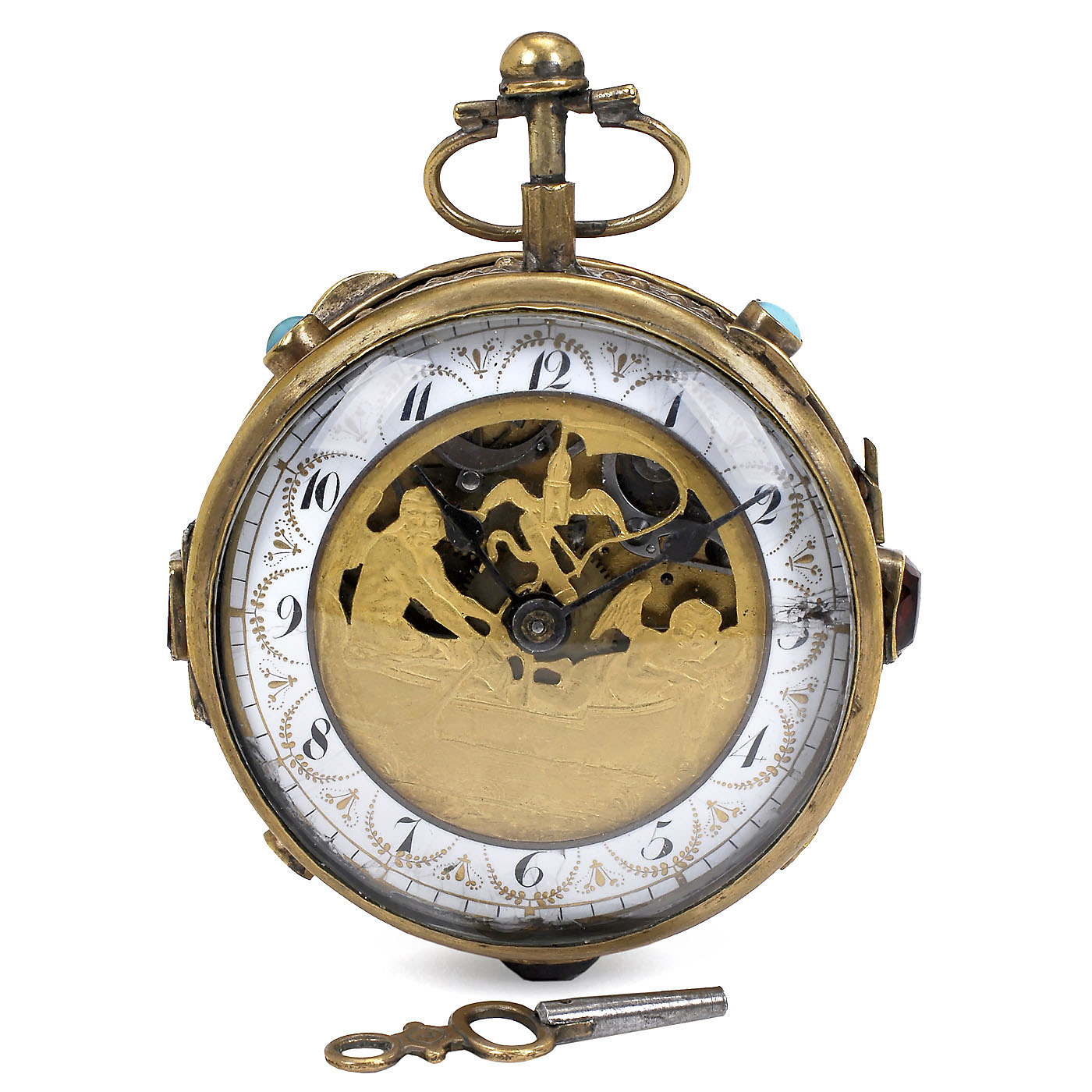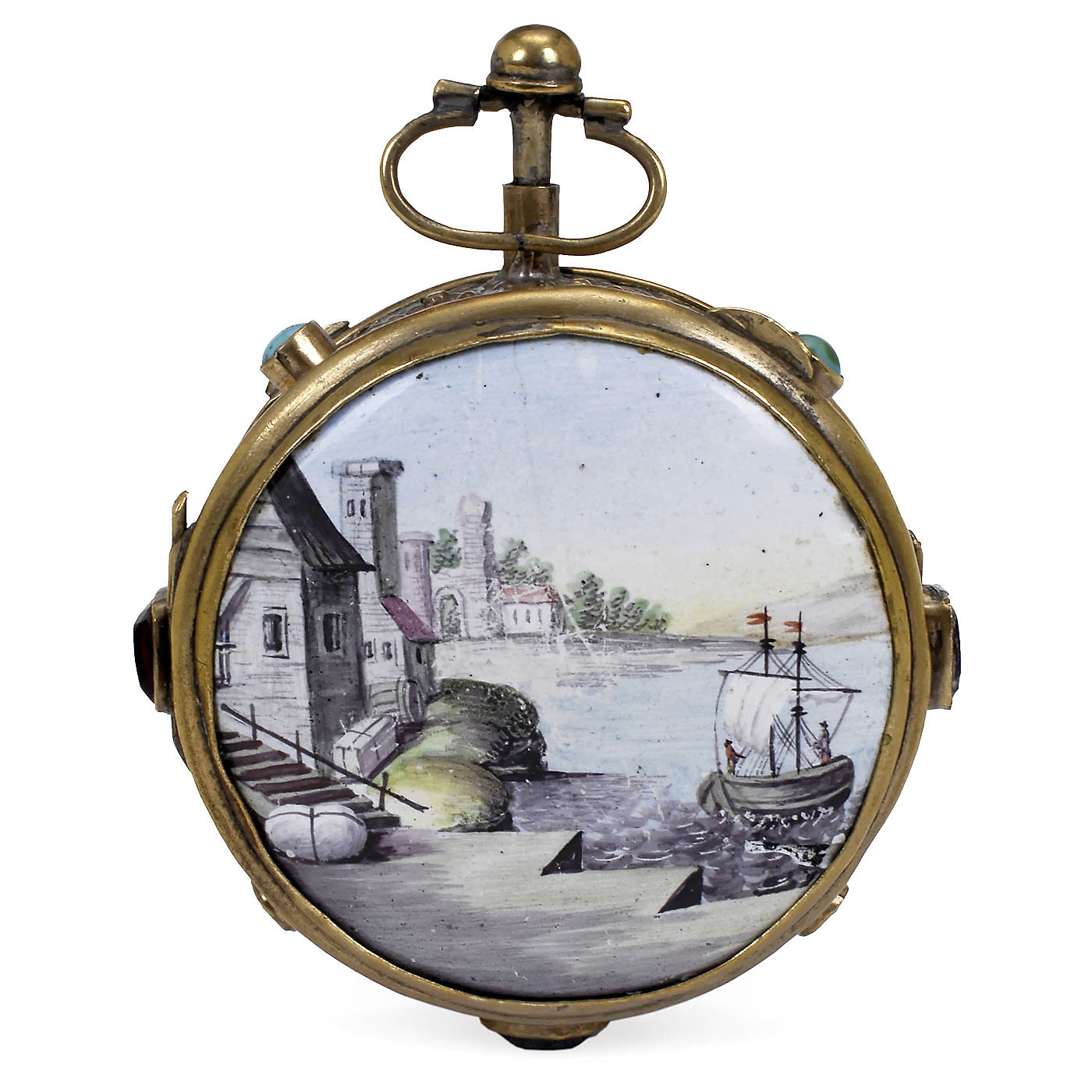No. 233, with 2-inch (5 cm) enameled annular Arabic dial with central gilt-metal allegory of Love and Time, quarter-repeat time-and-strike on two gongs, single-air sur-plateau movement with 21 teeth (not examined out of case), stone-set stamped brass case with pierced inner lid and enameled outer lid depicting a harbor, diameter 2 1/8 in. (5,5 cm), some losses to enamel, musical movement in playing condition, watch running and striking but not guaranteed. With one key. An attractive and unusual piece.
