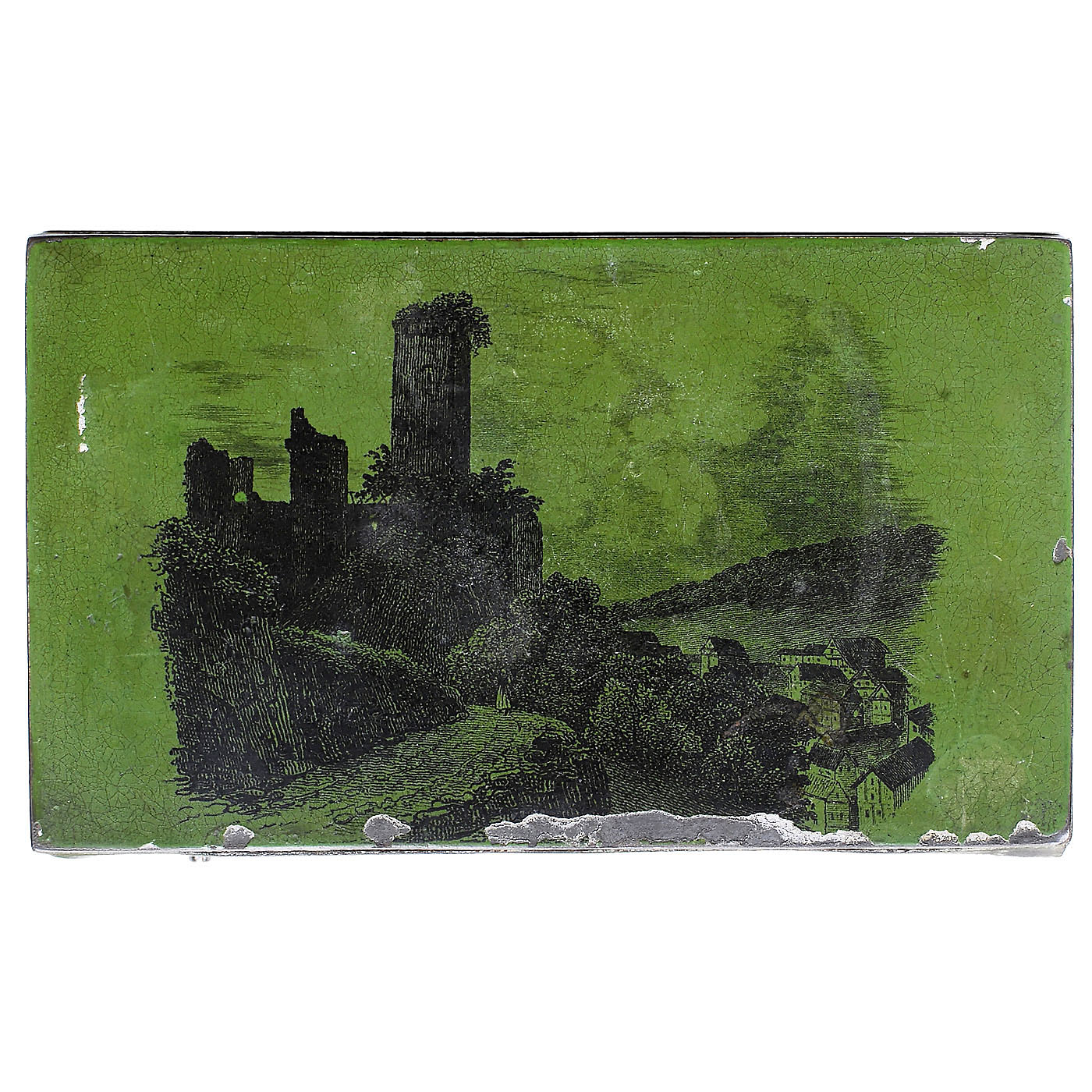 No. 11954, playing "The Mermaid's Song" by Haydn in two revolutions, with fine single-piece comb of 82 teeth (complete) stamped "F. Nicole", the bedplate stamped "Fres. Nicole", in green-painted tinplate case with lithographed image on lid depicting "Château de Sonnenberg près de Wiesbaden", wd. 4 in. (10 cm), cylinder 2 ¾ in. (7 cm), movement in good restored playing condition, lid split on corner, spots of paint loss. With key. The complete air plays for around 1 minute and 55 seconds on two revolutions. - A rare and early Nicole tabatière.