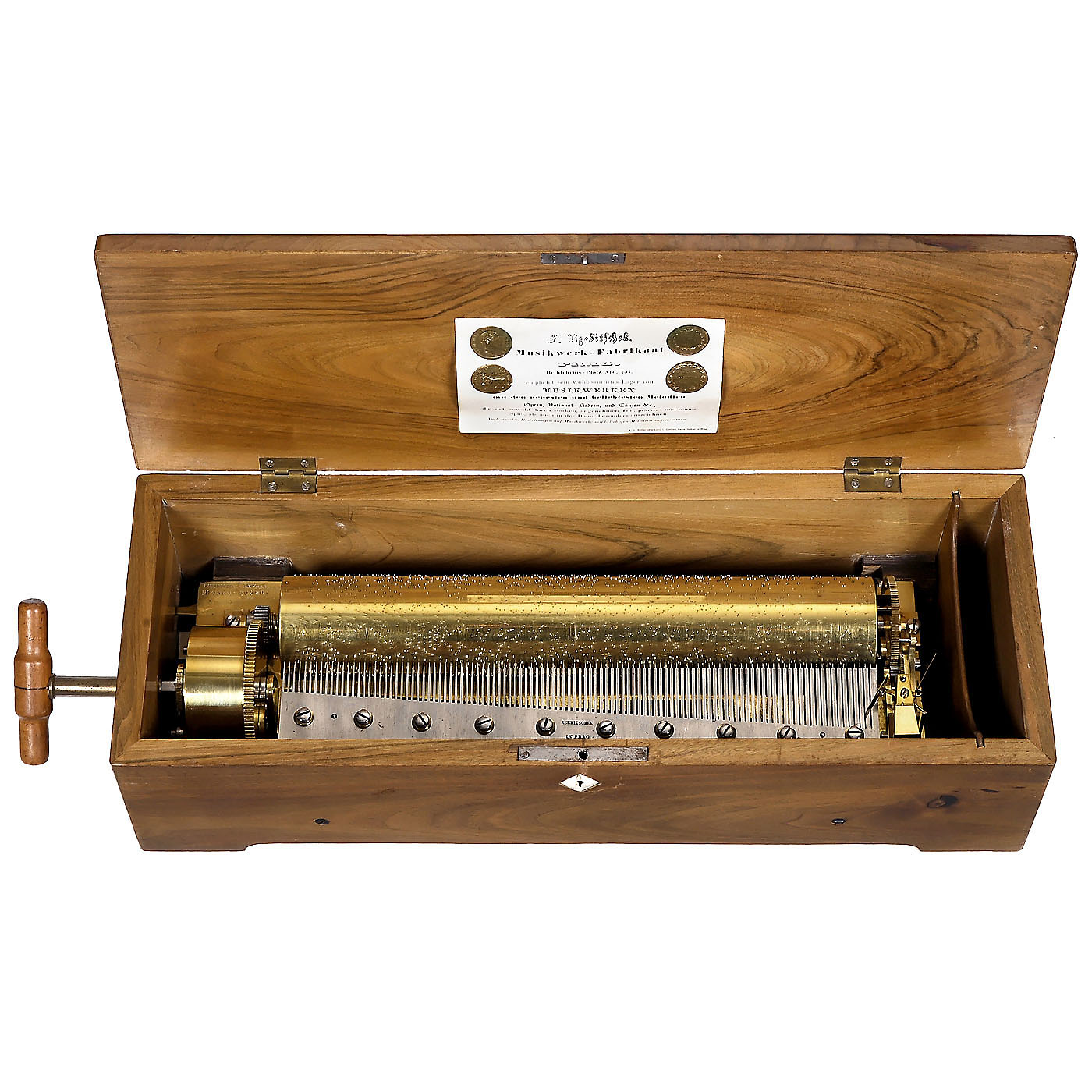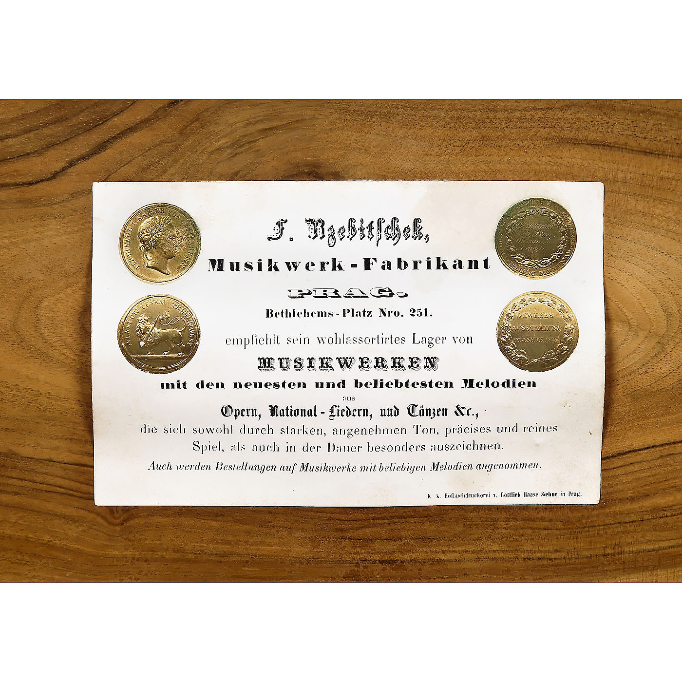 No. 2564/3608, playing 6 airs, with 110 teeth in comb (complete), bass teeth on the right, double-tipped extreme bass tooth, brass comb washers and bedplate, bedplate and comb both stamped "Rzebitschek in Prag", instant-stop, polished walnut case with external controls and tune sheet of "F. Rzebitschek, Musikwerk-Fabri kant, Bethlehems-Platz Nro. 251, Prag", wd. 18 ½ in. (47 cm), cylinder 12 ¼ in. (31 cm), superb restored playing condition. With original wood-handled key, additional tune sheet and leather-covered traveling case (back seam split). A large and unusually fine Rzebitschek musical box that was built to impress. The manufacturer information sheet, decorated with 4 embossed gilt medals - including one for an exhibition in 1831, praises the full, rich tone, precise arrangements and length of play of Rzebitschek musical boxes. Special orders of customized repertoires also accepted. - Literature: Luuk Goldhoorn, "Das Mechanische Musikinstrument" (Gesellschaft für selbstspielende Musikinstrumente e.V.), 39th year, Vol. 117 (April 2013).