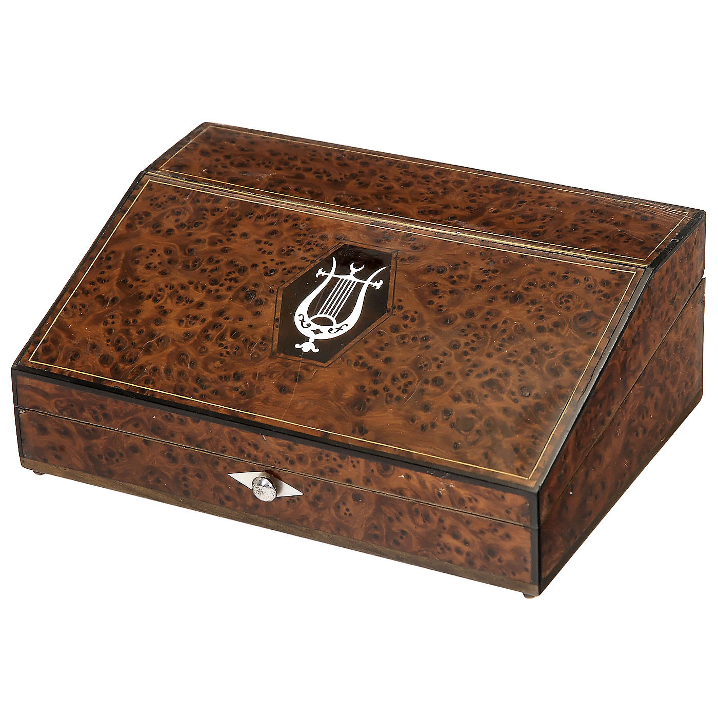 No. 1091, with recessed velvet-covered tray and interior containing Palais Royale steel, gilt-metal and mother-of-pearl implements: 2 snowflake-thread winders, bodkin, tambour hook and scissors, thimble and needle case with micro enamel in gold inlay, the silk-lined lower section with two-air cylinder movement of 64 teeth in single-piece comb (complete), stamped "F. NICOLE", in thuya-veneered case formed as a miniature escritoire with boxwood stringing and mother-of-pearl lyre inlay on lid, 5 x 3 ½ in. (12,8 x 8,8 cm), cylinder 2 3/8 in. (6 cm), light hairline cracks in thimble and needle case lid, excellent playing condition. With key. - A rare miniature sewing necessaire with fine musical accompaniment - a highlight of the Goldhoorn collection.