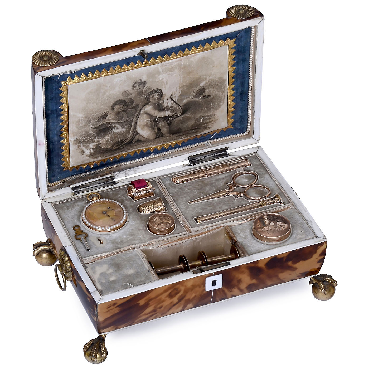 Comprising 14-carat seed-pearl-set gold fob watch, no. 37625, with fusee movement and three-color chased design of flowers and ferns; two recessed compartments containing gold, steel and gilt implements: scissors with guard, thimble, spools, tape measure, pencil, engine-turned and engraved needle case and two pill-boxes with hallmarks. - Two-air cylinder movement with solid bedplate and sectional comb in 19 groups of 3 (complete), bass teeth to the right. - In tortoiseshell case with ball-and-claw feet and printed silk picture in the lid, wd. 8 ¼ x dp. 5 ½ x ht. 3 ¾ in. (21 x 14 x 10 cm), cylinder 2 1/8 in. (6 cm). Musical movement in good playing condition, watch untested, missing one seed-pearl. With key. An exquisite objet de vertu. - Literature: Illustrated in Luuk Goldhoorn, "Three of a Kind", in: "MBSGB - The Music Box", vol. 28, no. 4, pp. 138-139.