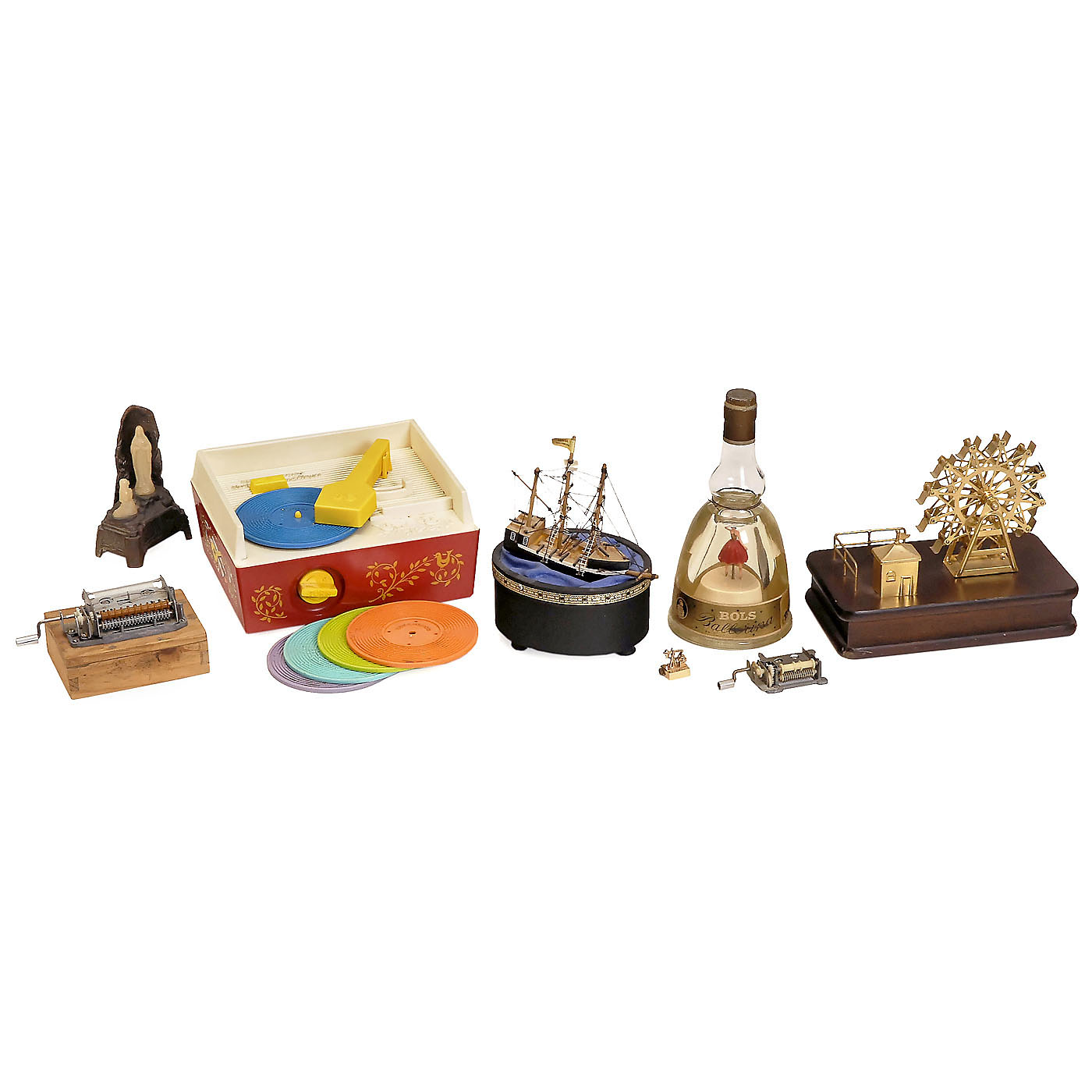 Fisher Price "Music Box Record Player" with five discs including "Camptown Races", souvenir musical box from Lourdes; a fairground ferris wheel and other items.