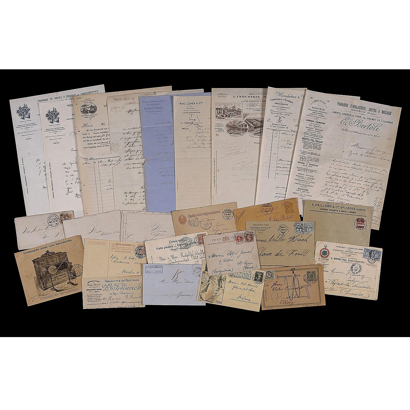 Including correspondence from Bornand Frères, G. Dutreich (Fantasies à Musiques, Paris), L'Industrie Musicale (sucessors to C.H. & J. Ullmann), Henri Vidoudez, Auguste L'Épée & Cie., an account statement from Hermann Thorens, envelopes from E. and A. Paillard and E. Paillard & Cie., a 1902 postcard to Rudolph Wurlitzer, card to Jules Cuendet, an 1895 card from C.E. Brun (Nicole Frères) to Alfred Junod and other items. - A treasure trove for historians of mechanical music.