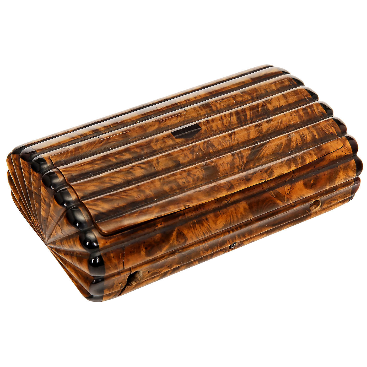 With two-air movement, in reeded burr-wood case with sunburst sides and tortoiseshell lining, wd. 3 ½ in. (9 cm), movement inoperative, missing controls, not examined out of case.