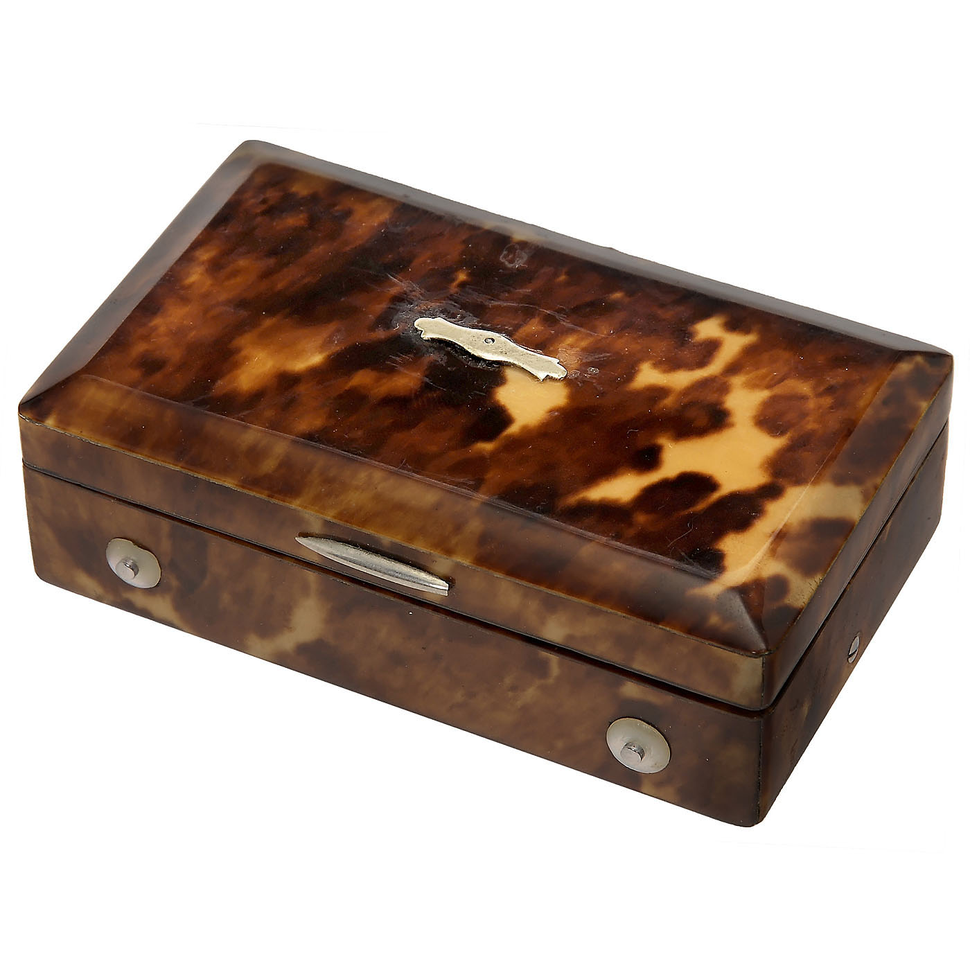 Stamped "IM", playing two airs, with sectional comb of 57 teeth in 19 groups of 3 (complete), bass teeth on the right, treble on the left, in tortoiseshell-veneered case, wd. 3 ½ in. (9 cm), cylinder 2 ¼ in. (5,8 cm), good restored playing condition. With key.