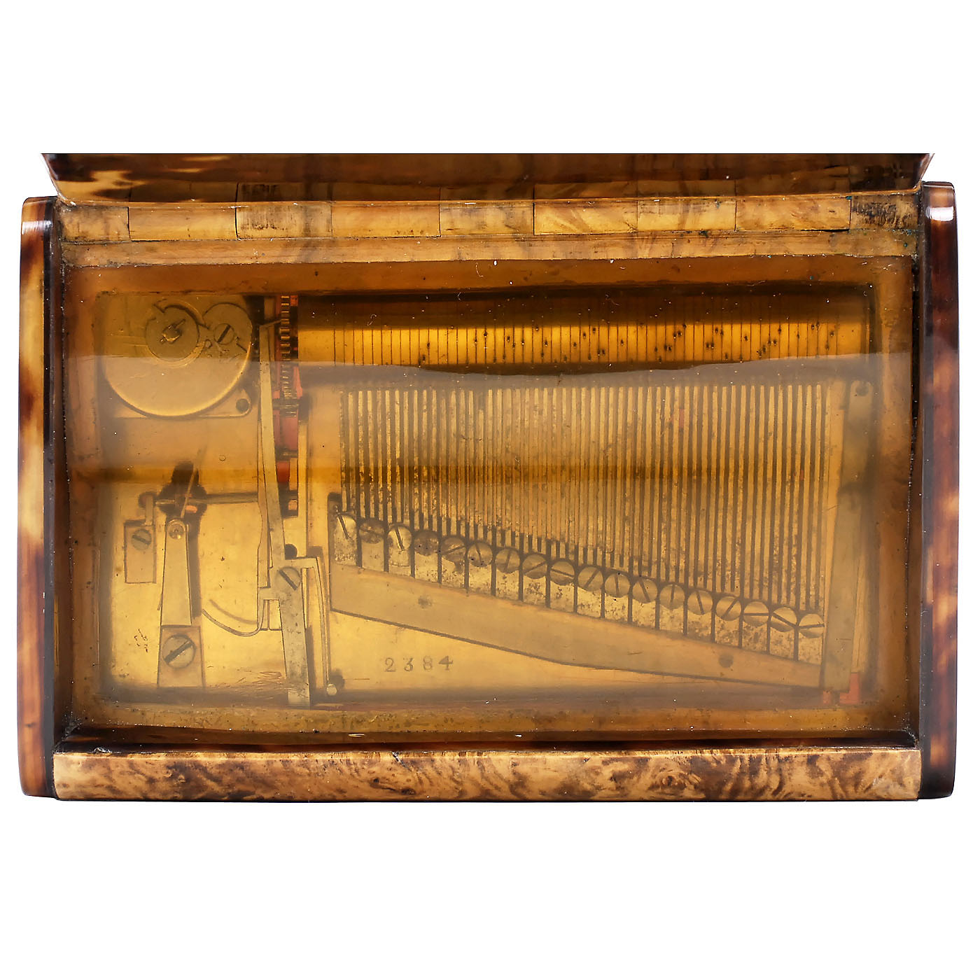 No. 2384, playing two airs, with sectional comb in eighteen groups of three teeth (two teeth neatly replaced, extreme treble tooth off - probably a factory adjustment), in burr-wood case with inset painted lakeside scene, figured tortoiseshell borders and lining, wd. 3 ½ x dp. 2 ¼ in. (9 x 5,8 cm), with key, minor chip on lip. Fine playing condition. - John Sandy of Alyth, Perthshire, is credited with the invention of the "hidden hinge" on snuff boxes. Since Sandy had been bedridden following an accident in his youth, Charles Stiven of Laurencekirk took over the manufacture and marketing of his design.