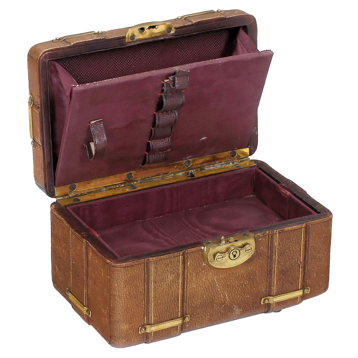 Suitable scale for a French fashionable doll or a bébé, tooled leather-covered exterior with brass banding, strapwork handle, burgundy silk-lined interior with lift-out tray and matching paper-lined lower section containing two-air cylinder musical movement ("Faust - Valse" and "Lucia di Lammermore") with disguised spring for activation when lid is opened, underside with partial tune-sheet of "B.A. Brémond, Musical Boxes, Manufacturer, Rue Pradier 7, Geneva", wd. 5 ¾ x ht. 3 in. (14,5 x 7,5 cm), playing but movement would benefit from cleaning and adjustment. With key. An unusual musical accessory.