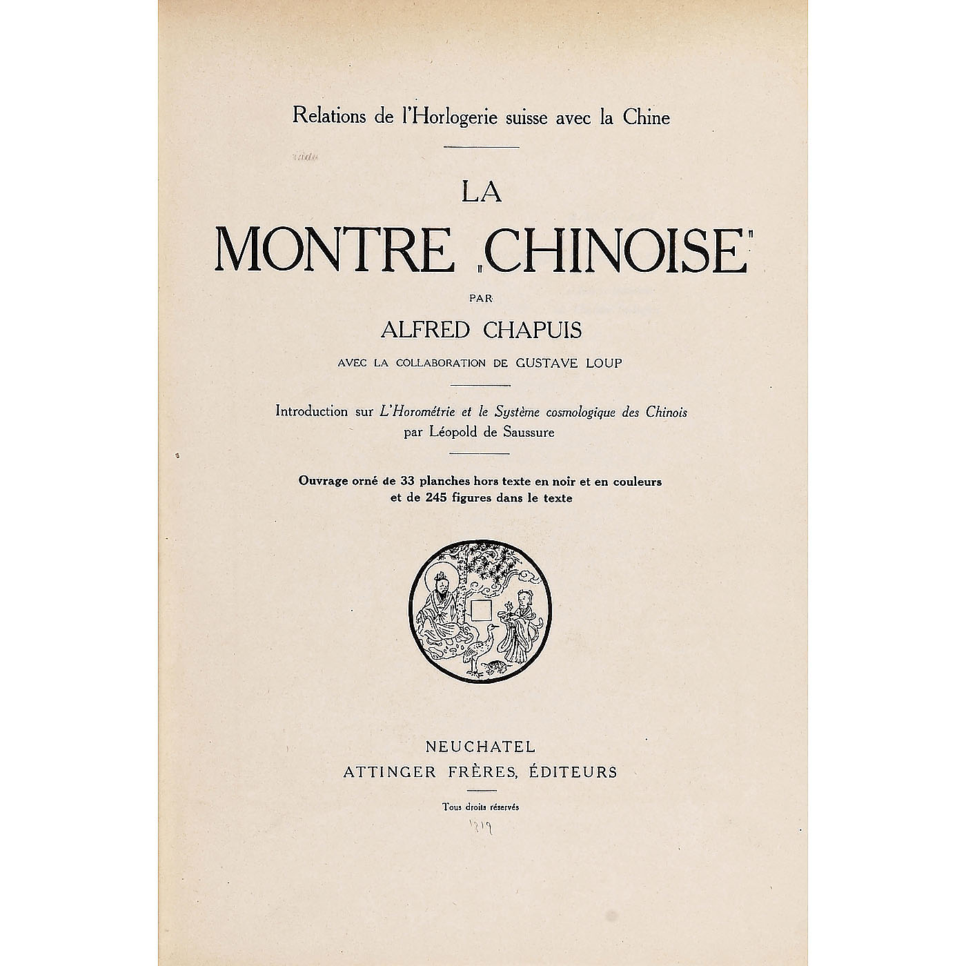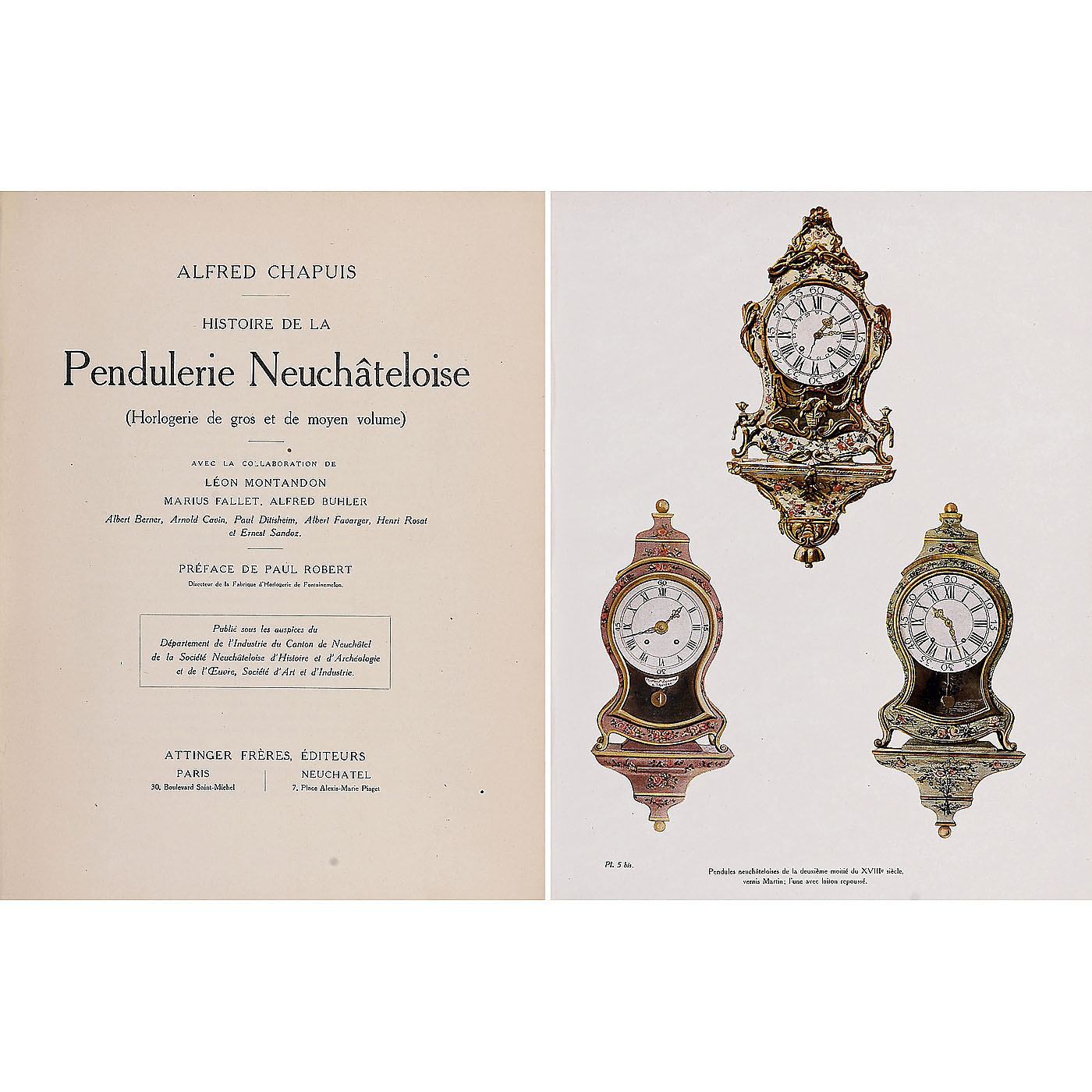 1) "Histoire de la Pendulerie Neuchâteloise", Alfred Chapuis in cooperation with Léon Montandon, Marius Fallet and Alfred Bühler; published by Attinger Frères, Paris/Neuchâtel, 1917, 490 pages, 377 figures, new binding with embossed leather spine. - 2) "Pendules Neuchâteloise - Documents nouveaux", Alfred Chapuis in cooperation with Charles Kehrli, published by Librairie Maurice Reymond & ses Fils, Neuchâtel, 1931, 274 pages, 290 figures, 21 plates, linen binding, with personal dedication by Alfred Chapuis. - And: 3) "La Montre Chinoise", Alfred Chapuis in cooperation with Gustave Loup, published by Attinger Frères, Neuchâtel, 1919, 272 pages, 239 figures, c. 1960 rebound, leather spine (damaged).