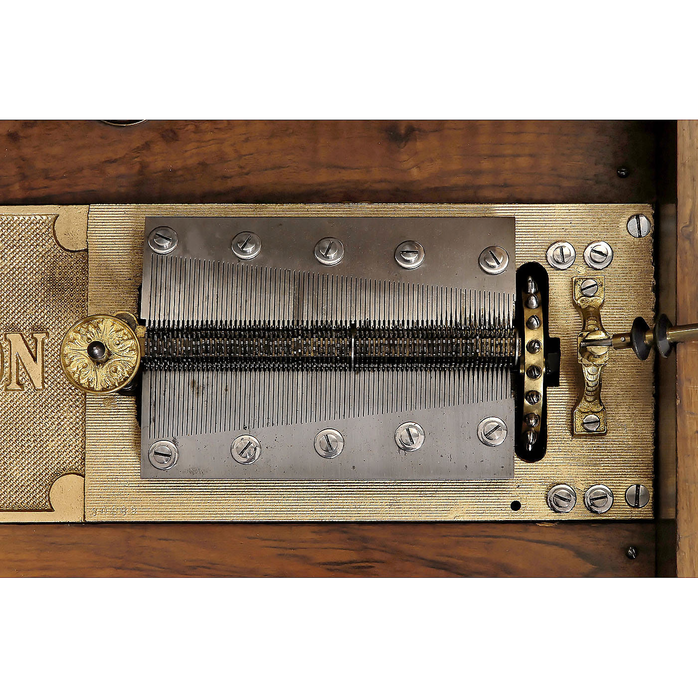 For 153/4-inch discs. Manufactured by Polyphon Musikwerke, Leipzig. 154 teeth in duplex comb (complete!), walnut case with elaborate moldings, flower inlay on lid, original lithograph in lid, very good condition. With 40 discs! Excellent playing condition. - One of the most beautiful Polyphon table models. On matching table with drawer for the discs.