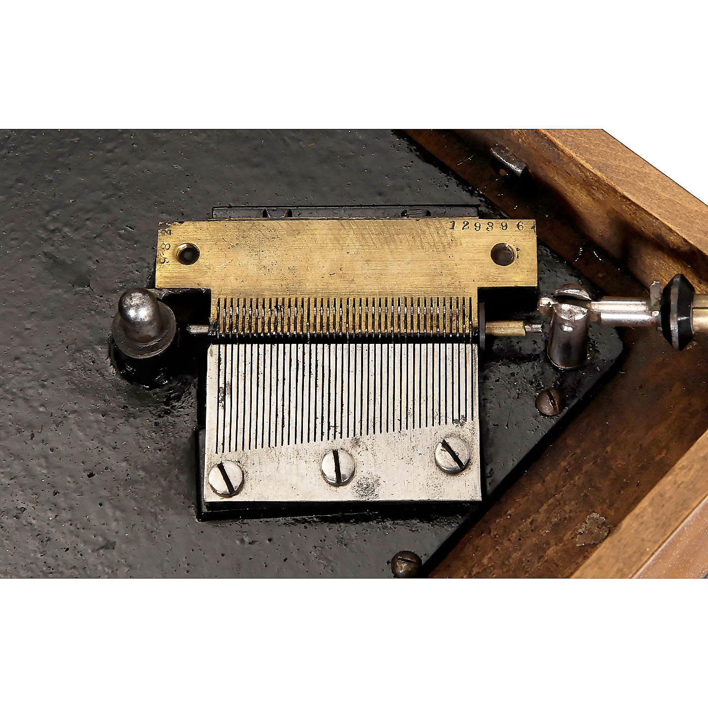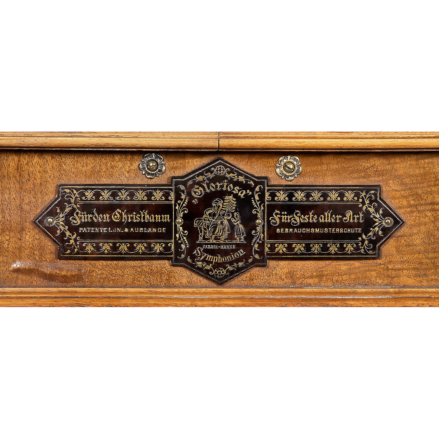 Manufactured by Symphonion Musikwerke, Leipzig, and J.C. Eckhardt, Stuttgart. For 6 1/10 in. discs, walnut case, 2 sides with "Symphonion Gloriosa" signs, size 16 1/3 x 10 4/5 in., working. An early and rare version of the Christmas tree stand. With 1 disc.