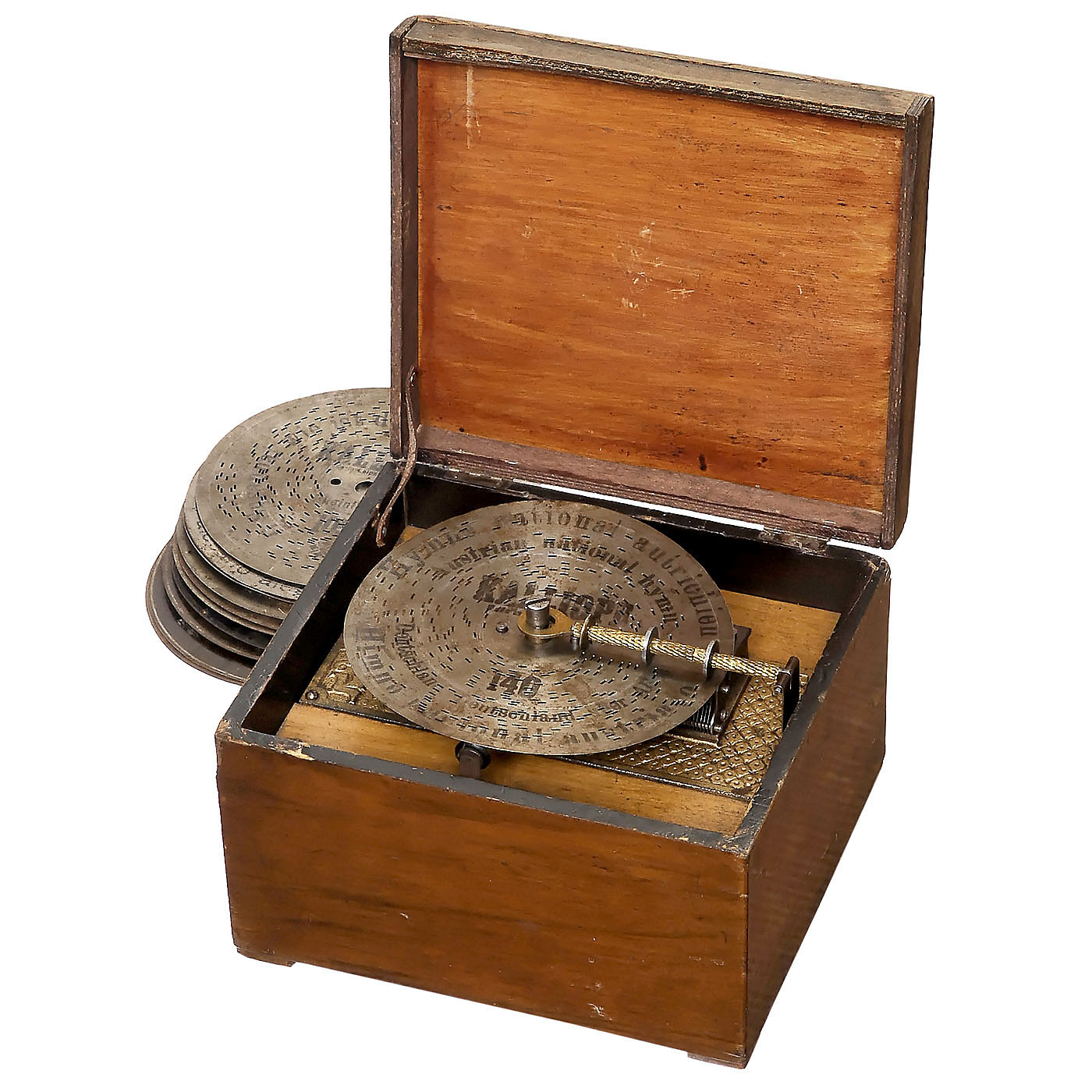 1) Symphonion No. 4, for 9½-inch discs, 72 teeth in 2 music combs (1 broken), parts of case replaced, working, with 14 discs. - And: 2) Kalliope No. 37, for 7-inch discs, 36 teeth in steel comb (complete), lid replaced, working, with crank and 11 discs.