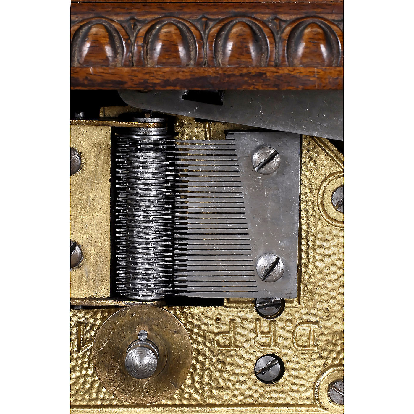 Schramberg, Black Forest. For 4 ½ in. discs, 30 teeth in steel comb (complete), brass-plate movement, anchor escapement, hourly release of the musical movement (optional), walnut case with brass ornaments, height 13 in., very good working condition, with 6 discs.