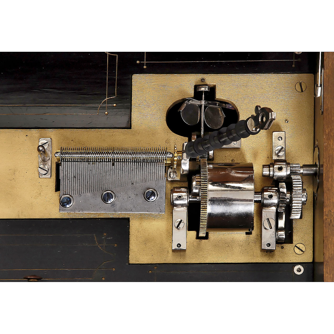 Manufacturer: "Bruno Rückert, Leipzig". 51 teeth in single comb (complete!), nickeled visible spring motor, walnut case (19 ½ x 13 ¾ x 7 ½ in.), Orphenion lettering in lid, with 10 discs. Plays excellently. - Orphenion boxes are very rare today, they are well-made and have a sound quite different from other makers.