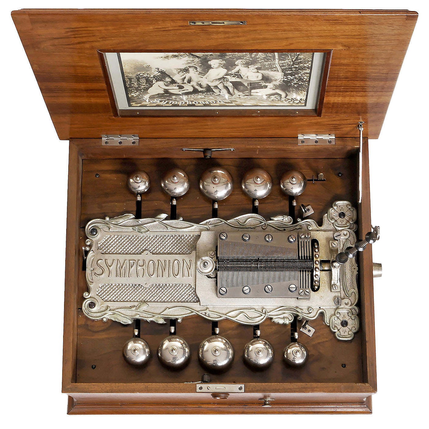 Symphonion Musikwerke, Leipzig. With 10 horizontal saucer bells (optional), for 14¾-inch discs, 120 teeth in duplex combs plus separate comb section to operate the bells (all combs complete), speed control, flower-decorated Art-Nouveau bedplate, original monochrome interior lid print, with 26 discs (3 of them new). - Excellent original playing condition.