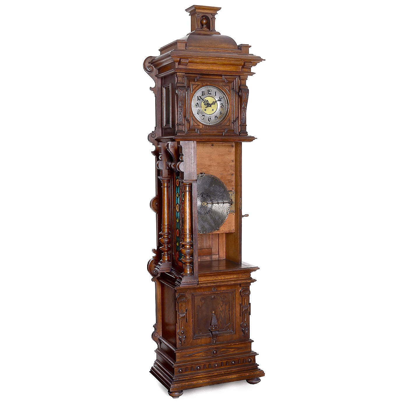 Manufacturer: Polyphon Musikwerke, Leipzig, for 15 ¾ in. discs, 78 teeth in music comb (complete!), 8-day Lenzkirch pendulum clock with strike on gong, in walnut case with leaded colored glass bull’s eye window, dimensions: 27 ½ x 17 x 103 in. - Excellent original playing condition. With 31 discs. - A spectacular eye-catcher in any collection or museum exhibition!