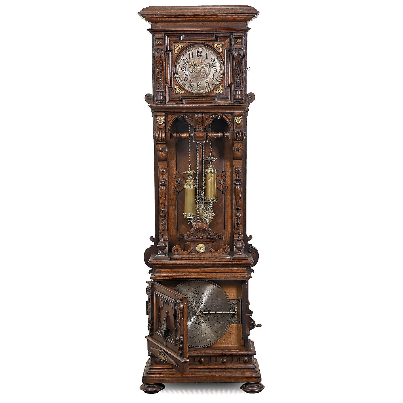 Polyphon Musikwerke, Leipzig. For 15¾-inch discs, with 154 teeth in duplex music combs (complete!), large Lenzkirch pendulum clock on the top, quarter strike on 2 spiral gongs, hourly trip to musical movement (missing string connection), impressive Renaissance-style walnut case, height 86 in. With 12 discs. - Very good original condition with exceptional sound! - Prove nance: Industrialist manor in Radebeul, near Dresden.