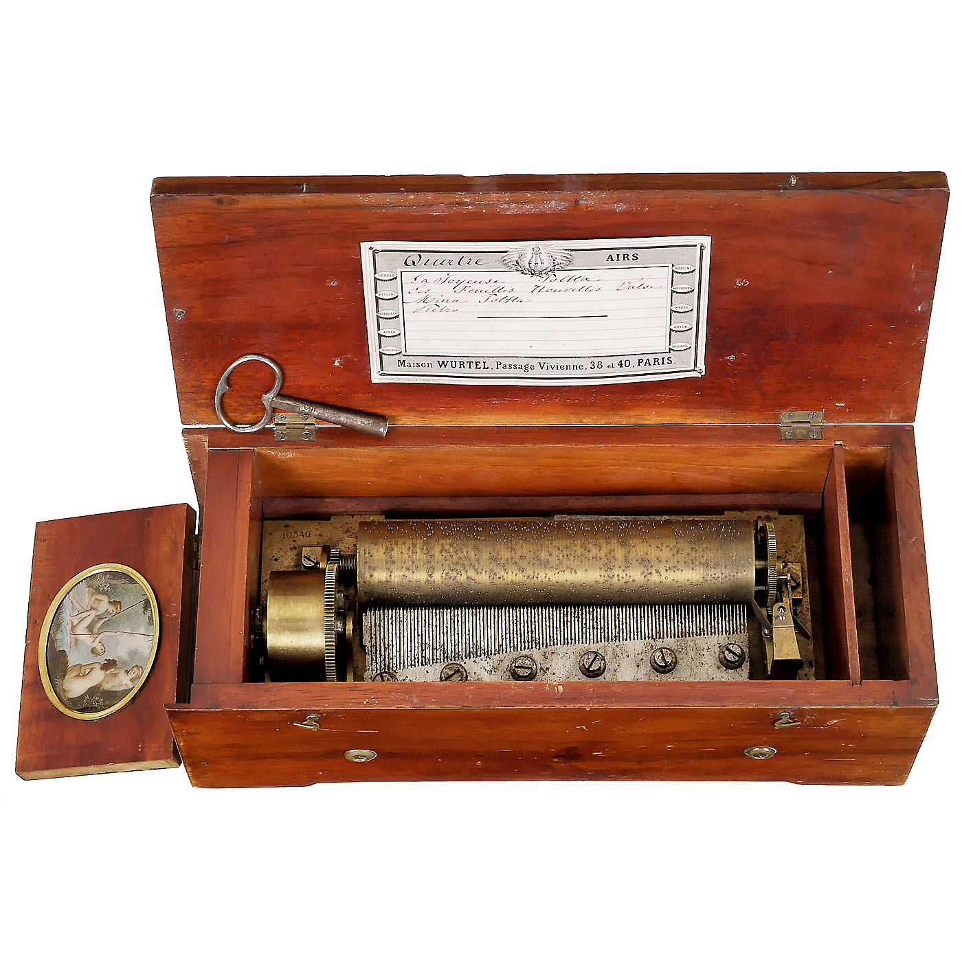 No. 10340, playing four dance airs, with 102 teeth in comb (complete), brass bedplate, instant-stop (missing pin), stained case, miniature of four bathing ladies at play on inside of endflap and tune-sheet with retailer's banner: "Maison Wurtel, Passage Vivienne, 38 et 40, Paris", wd. 15 in. (38 cm), cylinder 8 in. (20 cm), fine unrestored playing condition. With key.
