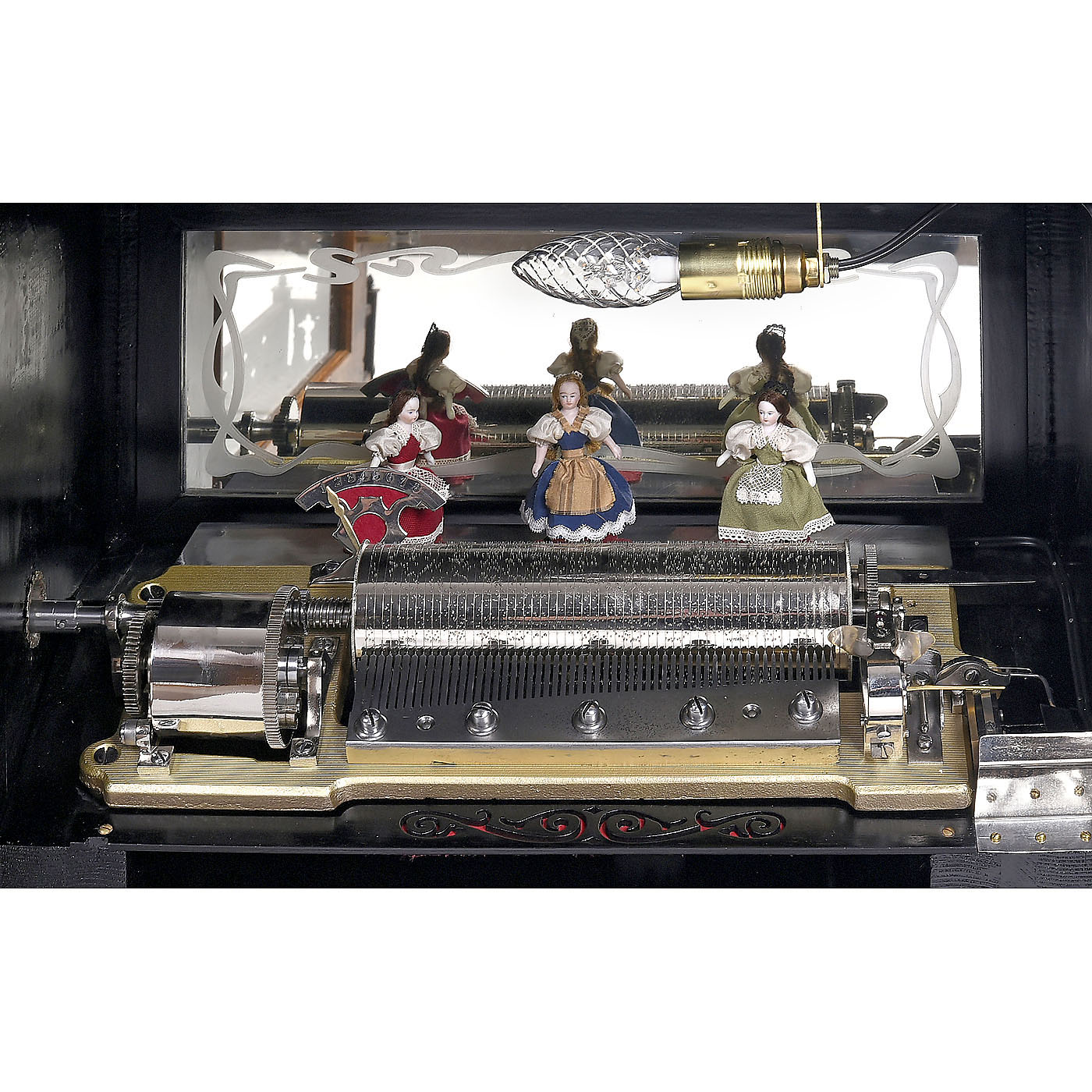 No. 104215, crank-wind coin-activated movement playing eight airs accompanied by 3 dancing dolls, with 57 teeth in comb (complete, 14 expertly replaced teeth), in walnut-veneered case with carved chalet-form facade, width 19 x height 22 x depth 11 in. (48,5 x 56 x 28 cm), cylinders 8 ¼ in. (21 cm), case restored, replacement feet. - Movement in excellent restored playing condition. With crank. - An impressive audio-visual display piece!