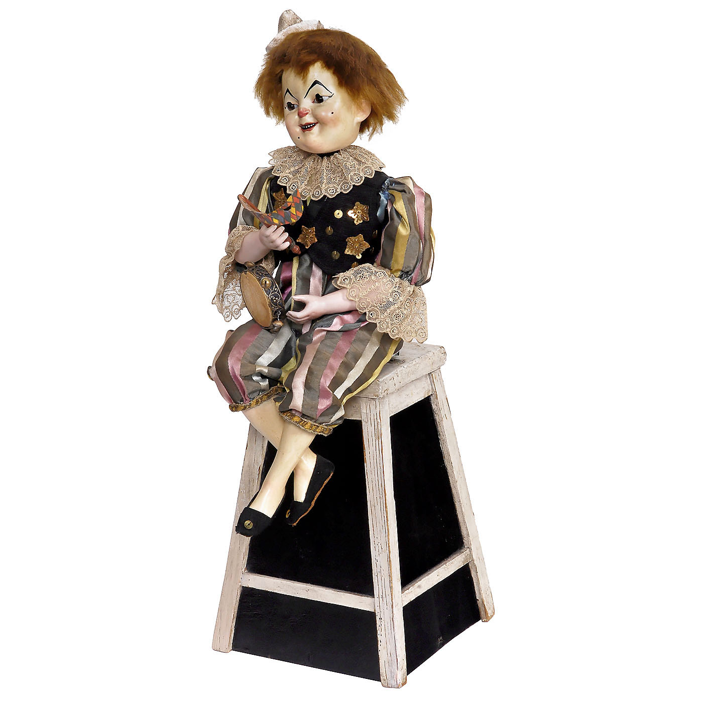 With round moon-like plaster-composition character head, laughing brown glass eyes, smiling mouth, bisque hands (minor restoration), slender articulated papier-mâché legs, dressed in striped satin suit, ruff and sequined waistcoat, going-barrel motor and two-air cylinder movement, overall ht. 21 in. (53 cm), paint renewed, objects suitably replaced. With brass acorn-form stop/start and pierced steel Vichy key. - The clown raises the mask to cover his face and lifts the tambourine three times while swinging his legs to and fro and titling his head from side to side as though laughing at his own performance. - A charming Vichy automaton with an unusual theme, puck-like character and a lively musical accompaniment. Good working condition.