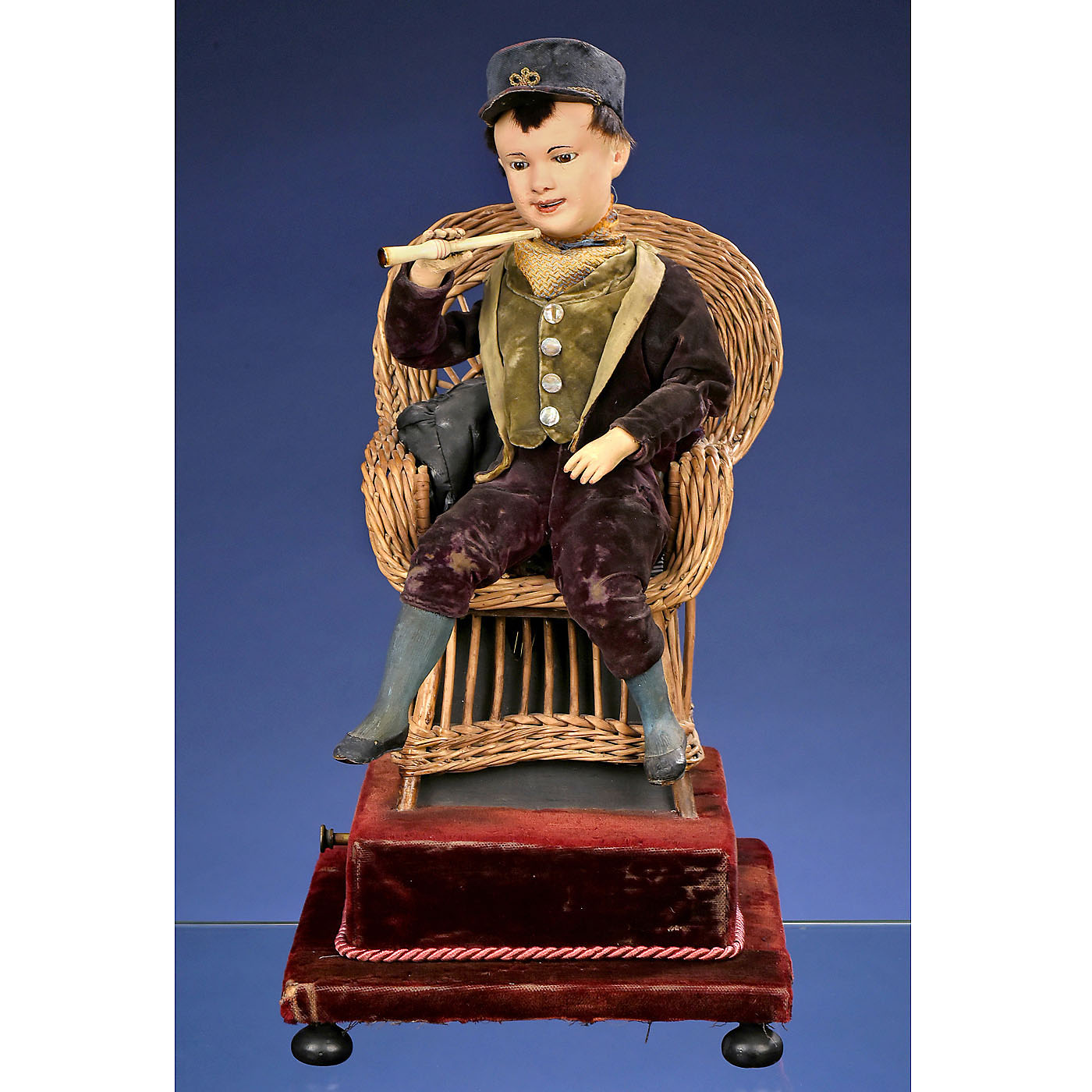 With plaster-composition head, fixed brown glass eyes, open smiling mouth and snub nose, sitting on balloon-backed basket chair, swinging his right leg, a cigarette-holder in his right hand, on two-tiered wood base containing going-barrel motor, single-air musical movement and bellows, dressed in probably original purple velvet suit and soldier's cap, ht. 20 in. (50 cm). With steel key and later brass stop/start. Face and hands repainted, papier-mâché torso without back, base not opened for mechanical inspection, alterations. - The automaton depicts a young boy "learning" to smoke. He raises the cigarette-holder to his lips to inhale, then turns his head away, coughs, moves his left arm and swings his leg. The smoke is cycled from the cigarette holder, through the body and out through the boy's mouth. The automaton is in working order, however the bellows require an overhaul/adjustment in order for the figure to smoke. - Literature: Bailly, "Automata, the Golden Age", p. 110, for a similar model depicting a schoolboy on a top hat. - A smoking automaton with an unusual and amusing sequence of actions, worthy of sympathetic restoration.