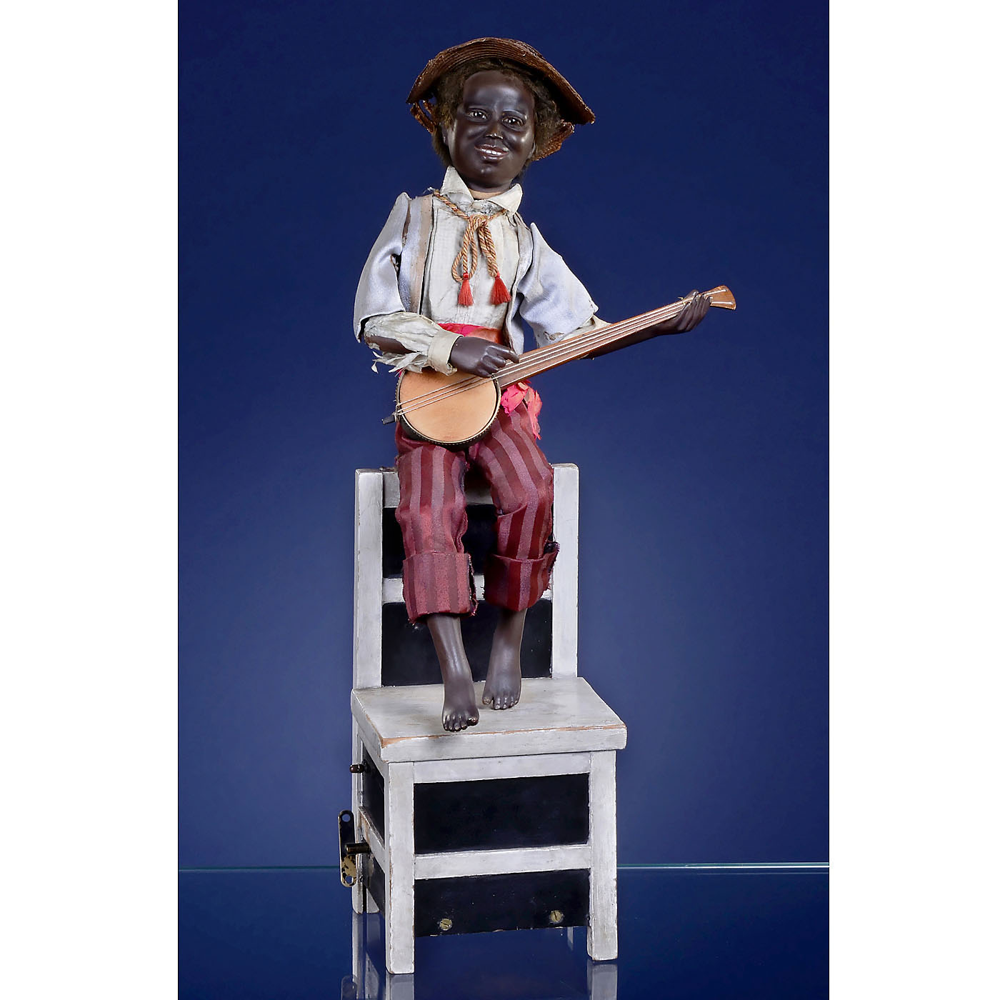 With plaster-composition head and hands, modeled as a young black boy with smiling expression, brown glass eyes, articulated eyelids and original mohair wig, sitting on the top rung of a white-painted chair that houses going-barrel movement playing two airs as the musician turns and nods his head, blinks, strums and lifts and crosses his right leg, dressed in silk shirt, string tie, light-blue jacket, sash and straw hat, height 22 in. (56 cm), with brass Vichy key and "acorn" stop/start. Good original working condition, well-preserved paint finish, early/original costume with later breeches. - Provenance: Auction Team Breker, 24 May 2014, Lot 553. Ex-collection of Jacques Damiot, No. VII in 1978 exhibition catalog "Automates Musiciens de Jacques Damiot" at the Palais Lascaris, Nice. Sixty-three automata from Damiot's collection were acquired by the town of Neuilly-sur-Seine and now form part of the Musée de Neuilly. - Literature: Bailly, "Automata, the Golden Age", p. 104. - A beautiful Vichy automaton with provenance from an early and historic French collection.