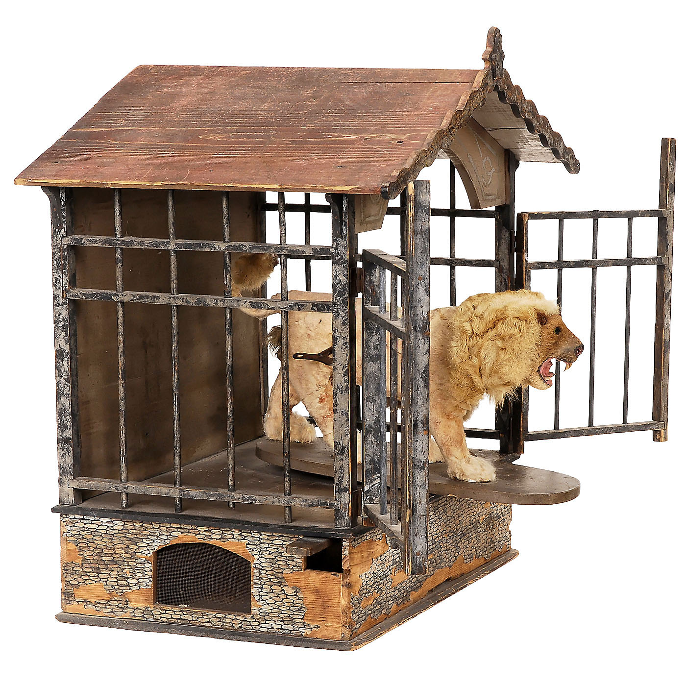 Germany, realistic hide-covered papier-mâché beast with astrakhan mane, open mouth with teeth and articulated head activated by counterweighted clockwork motor in the body, on platform base, in wood cage with painted finish, base with paper covering and pulley mechanism that causes the doors to fly open and the lion to spring from his enclosure, lg. of figure 16 in. (40 cm), cage ht. 24 in. x wd. 18 ½ in. (60 x 47 cm), fur sparse/recovered, paper losses on base, otherwise in good original working condition. With key.